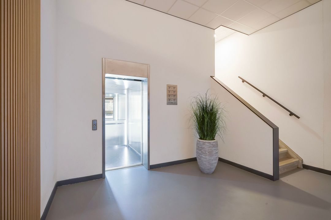 Entrance to the second floor via a secured and high-quality main entrance with doorbells and mailboxes, a video intercom system and stairs or elevator.
