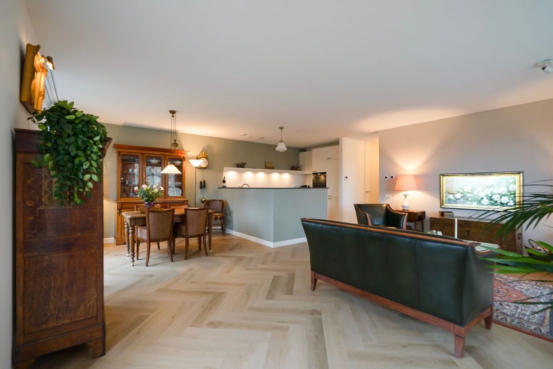 Sfeervolle woon/eetkamer met zeer veel lichtinval door de hoekligging, een luxe woonkeuken voorzien van een composiet aanrechtblad, veel opbergruimte, dubbele spoelbak en diverse inbouwapparatuur zoals een inductiekookplaat met geïntrigeerde afzuiging (merk Berbel), grote koelkast, vrieskast (V-Zug) oven, magnetron, warmhoudlade en vaatwasser (Siemens).