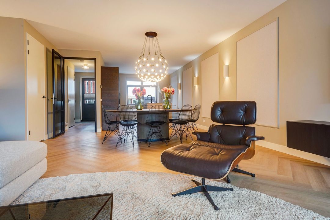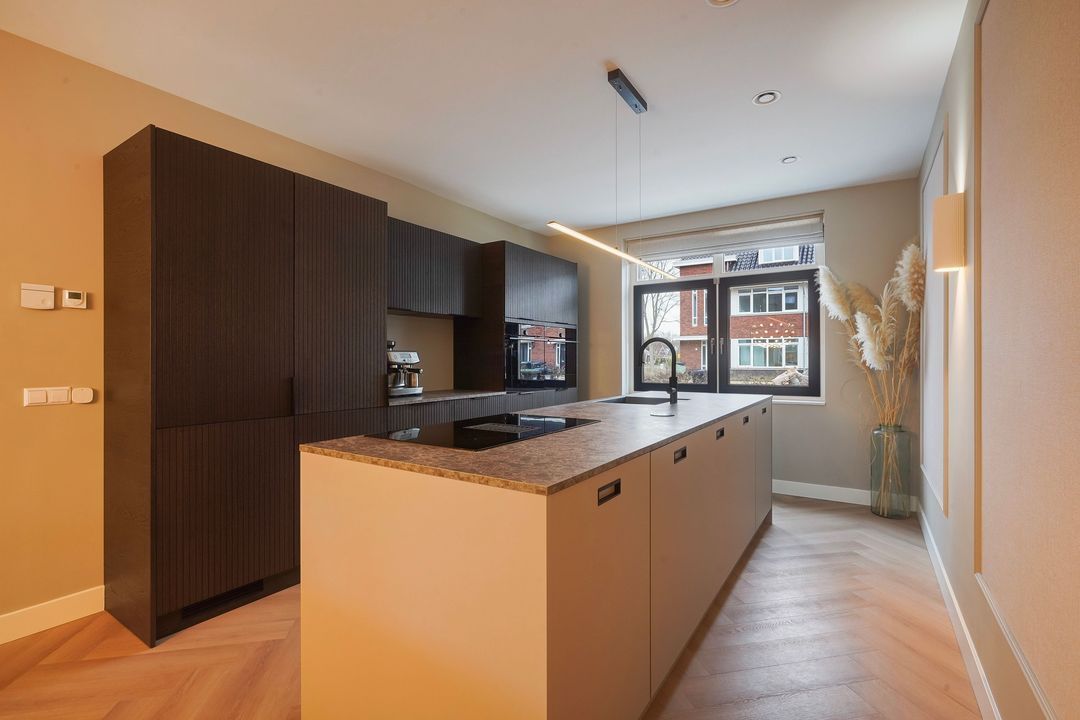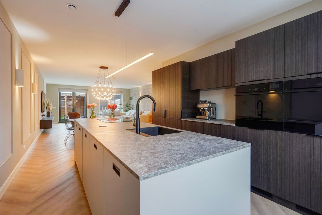 Through a beautiful Berkvens interior door, you enter the spacious and inviting living/dining room (approx. 9.59 x 5.82 m) with a storage cupboard under the stairs and a luxurious open-plan kitchen at the front, featuring a generous sink and cooking island with a Quooker and induction cooktop with integrated extractor hood, dishwasher, large refrigerator/freezer, steam oven, oven/combi microwave and ample storage space.