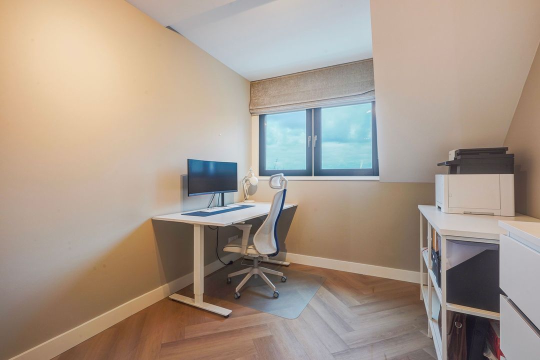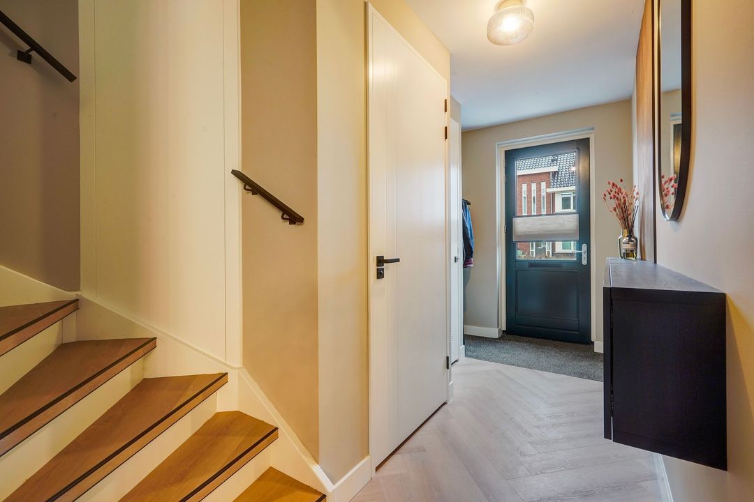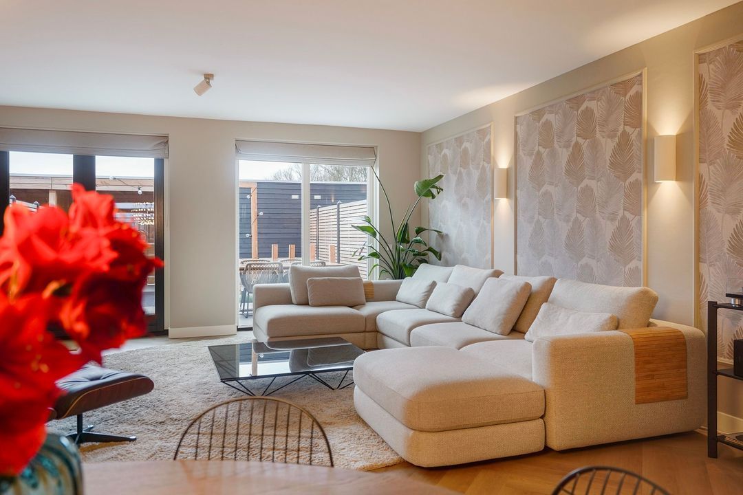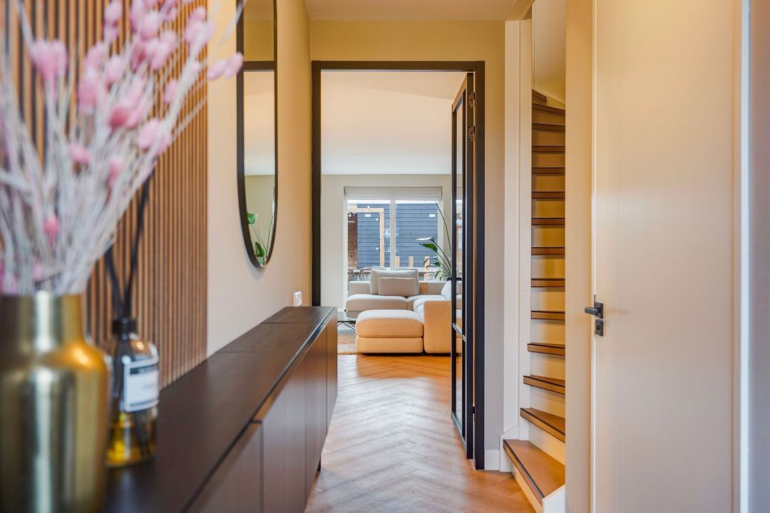 Through a beautiful Berkvens interior door, you enter the spacious and inviting living/dining room (approx. 9.59 x 5.82 m) with a storage cupboard under the stairs and a luxurious open-plan kitchen at the front, featuring a generous sink and cooking island with a Quooker and induction cooktop with integrated extractor hood, dishwasher, large refrigerator/freezer, steam oven, oven/combi microwave and ample storage space.