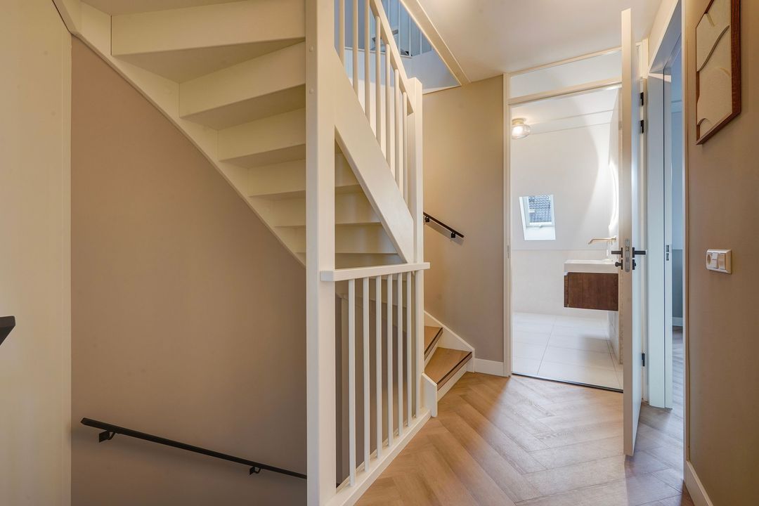 Overloop, fraai geheel betegelde badkamer voorzien van inloop(stort)douche, 2e toilet, dubbel wastafelmeubel met inbouw mengkranen, designradiator en dakraam.