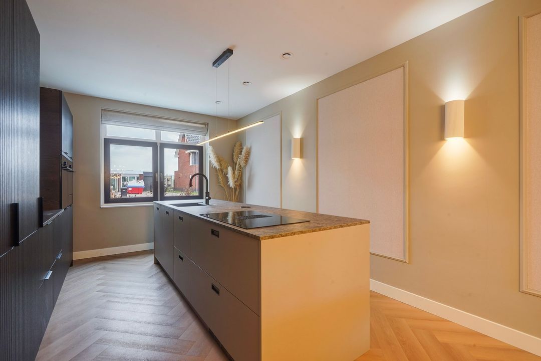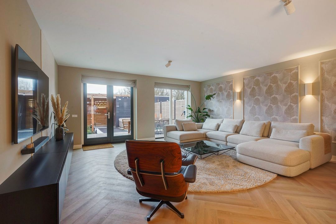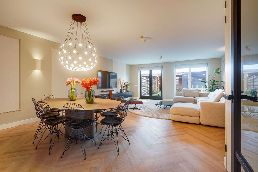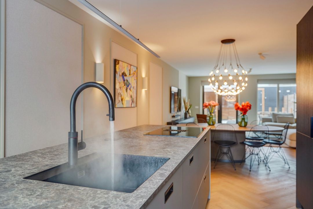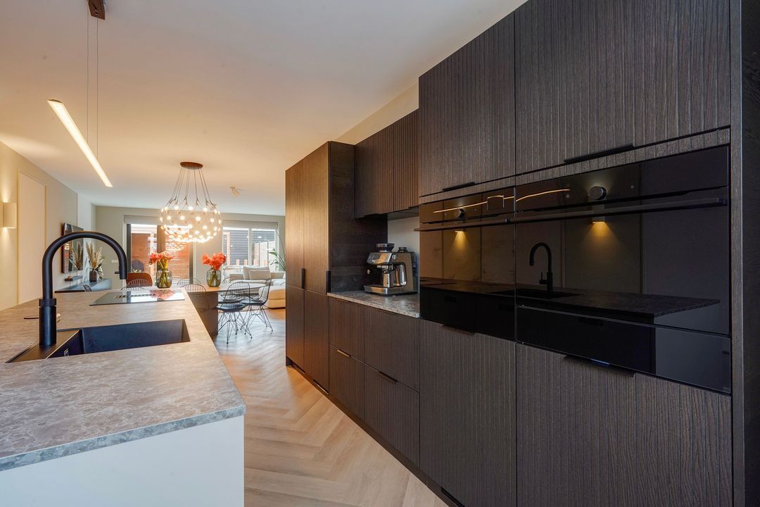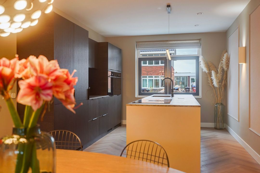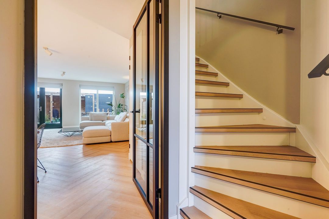 Through a beautiful Berkvens interior door, you enter the spacious and inviting living/dining room (approx. 9.59 x 5.82 m) with a storage cupboard under the stairs and a luxurious open-plan kitchen at the front, featuring a generous sink and cooking island with a Quooker and induction cooktop with integrated extractor hood, dishwasher, large refrigerator/freezer, steam oven, oven/combi microwave and ample storage space.