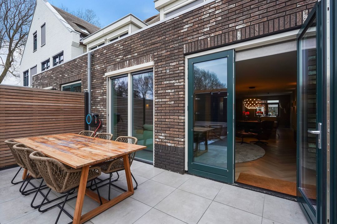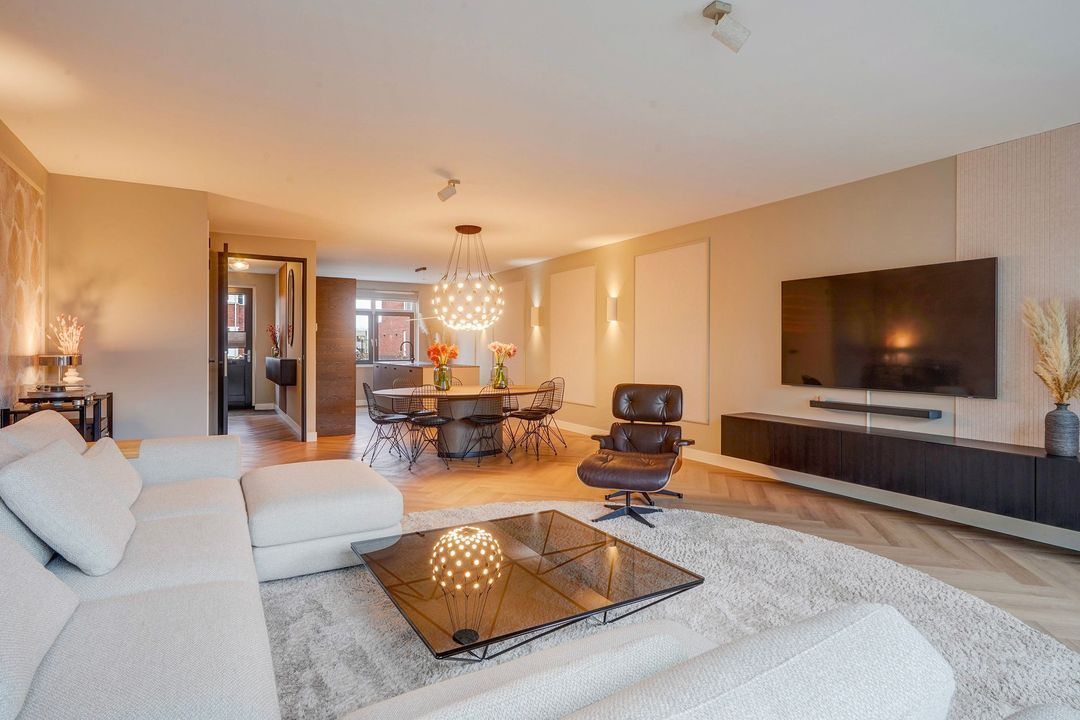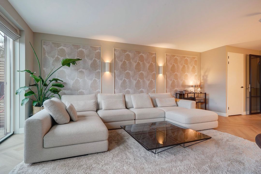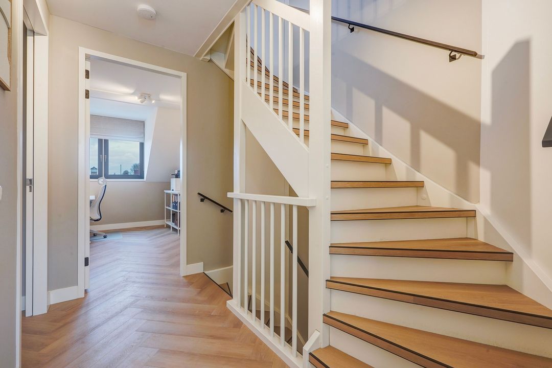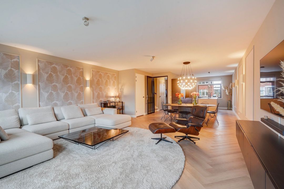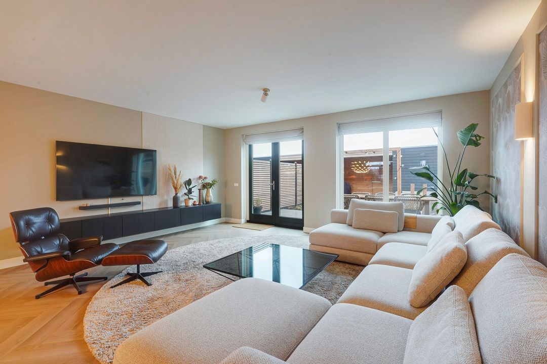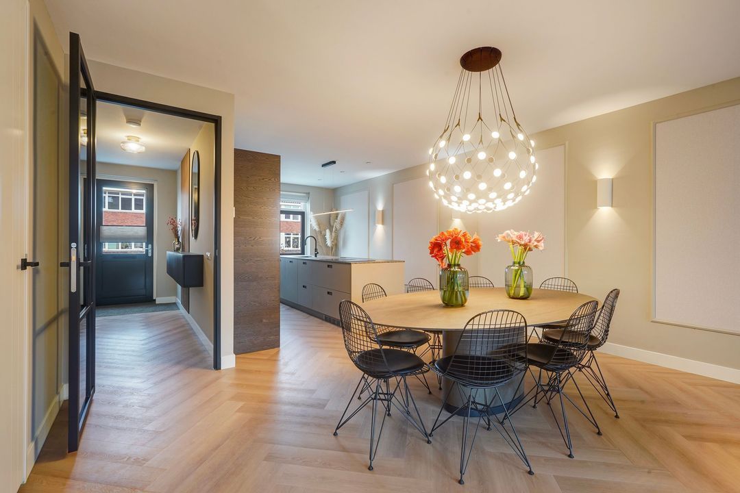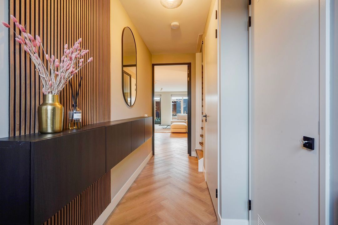 Through a beautiful Berkvens interior door, you enter the spacious and inviting living/dining room (approx. 9.59 x 5.82 m) with a storage cupboard under the stairs and a luxurious open-plan kitchen at the front, featuring a generous sink and cooking island with a Quooker and induction cooktop with integrated extractor hood, dishwasher, large refrigerator/freezer, steam oven, oven/combi microwave and ample storage space.