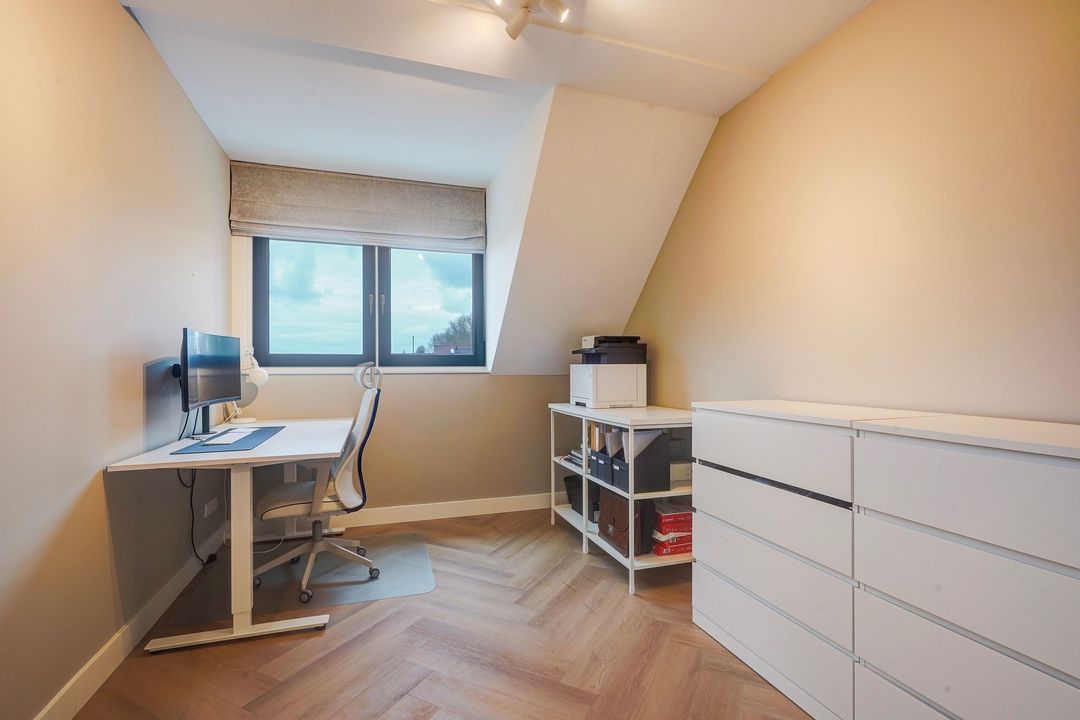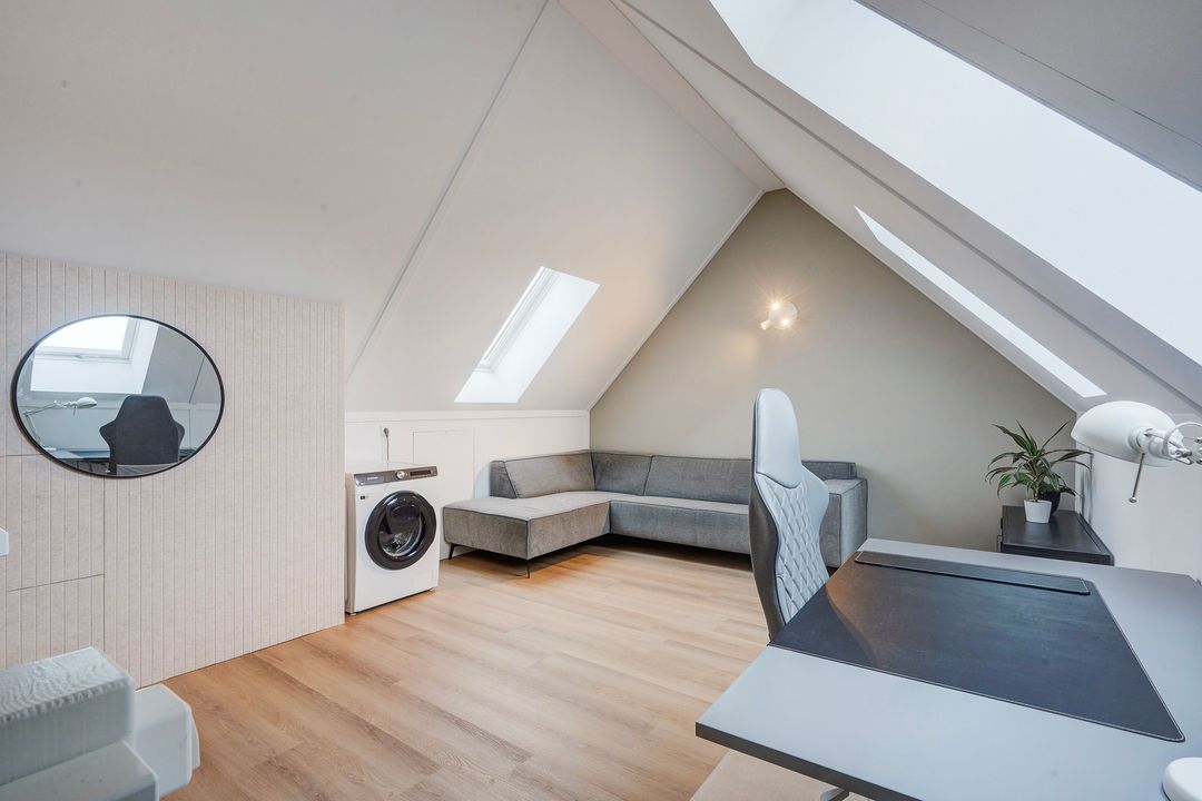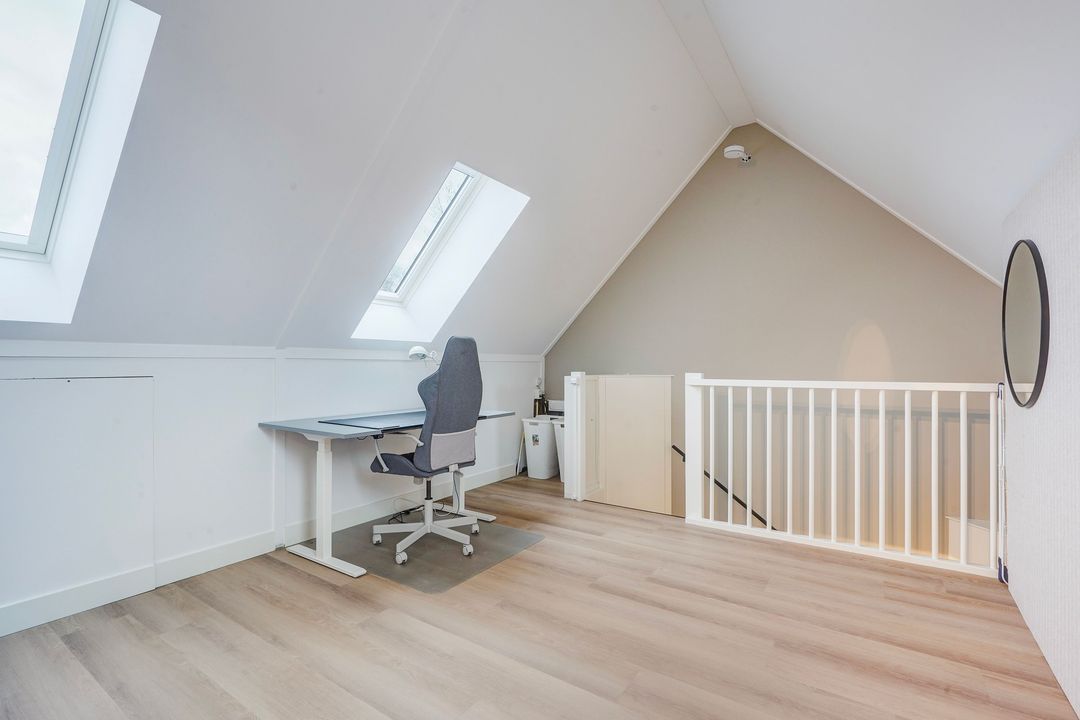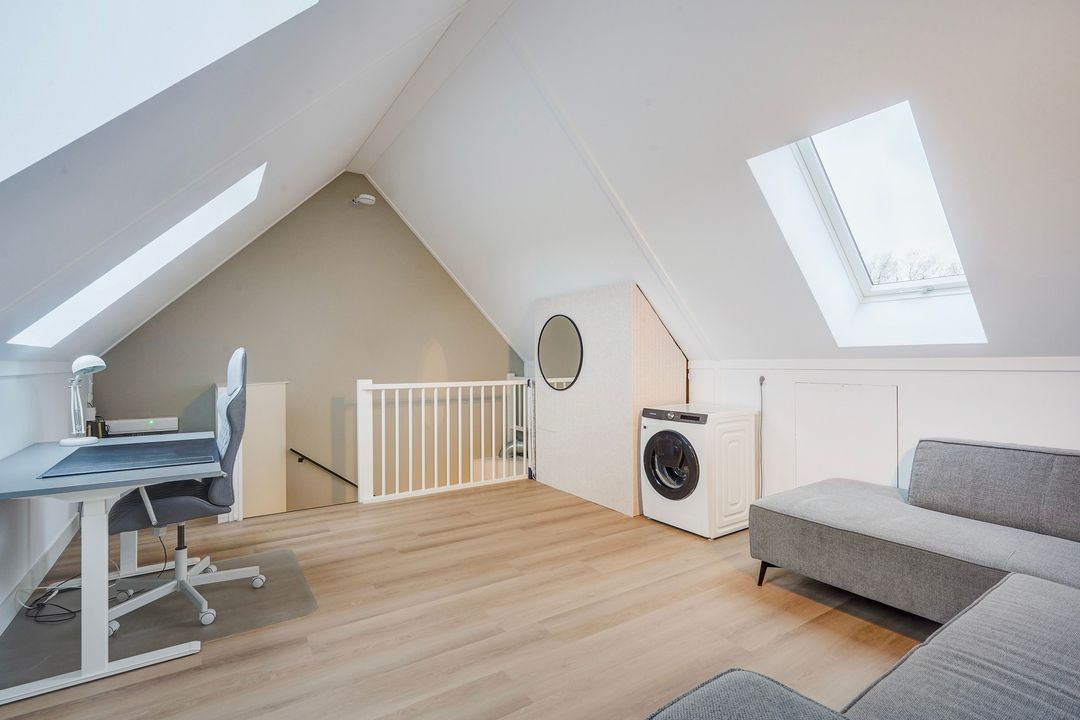 Ruime kapverdieping, eventueel op te splitsen in 2 slaapkamers, voorzien van 3 dakramen, veel bergruimte in de knieschotten en wasmachine-aansluiting.