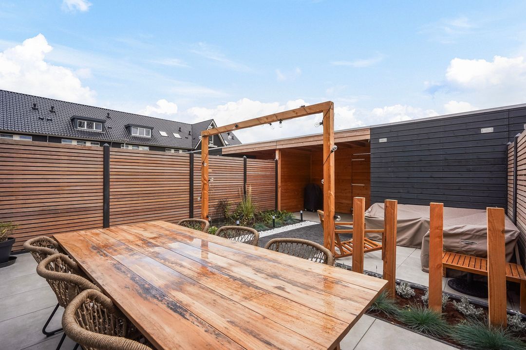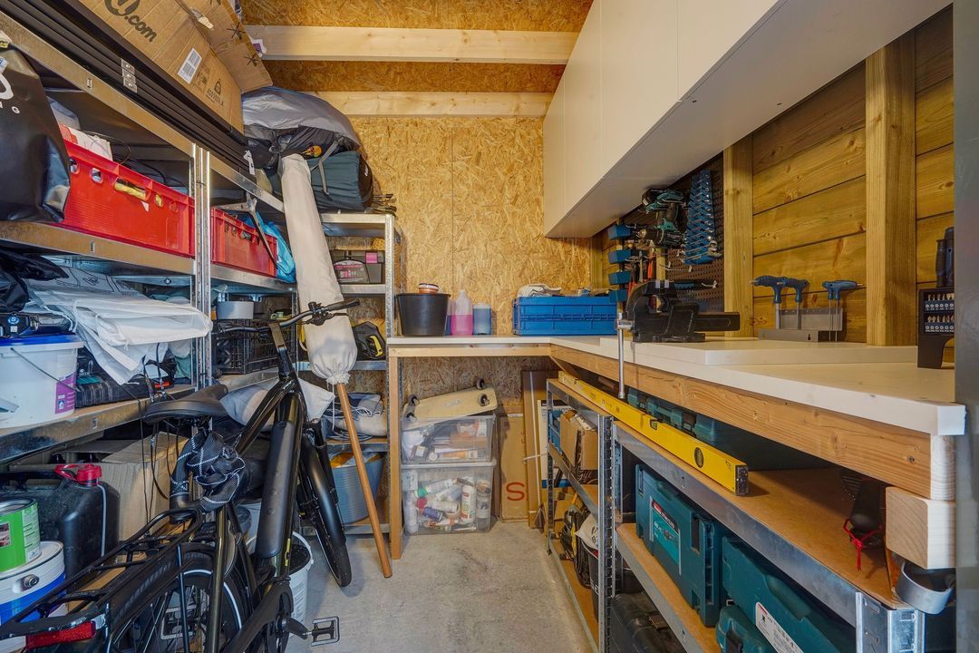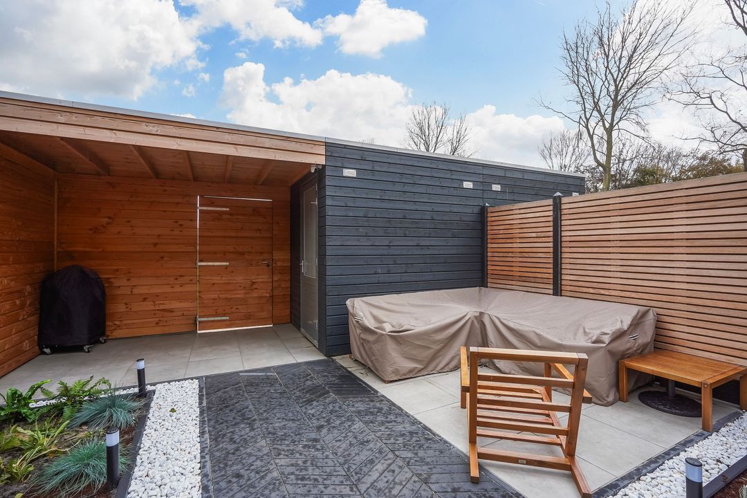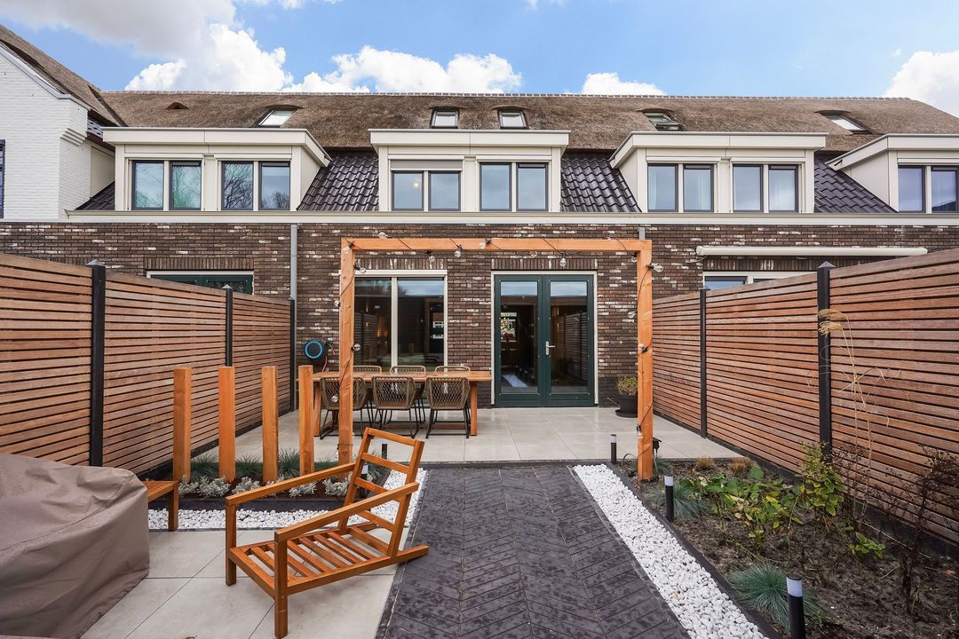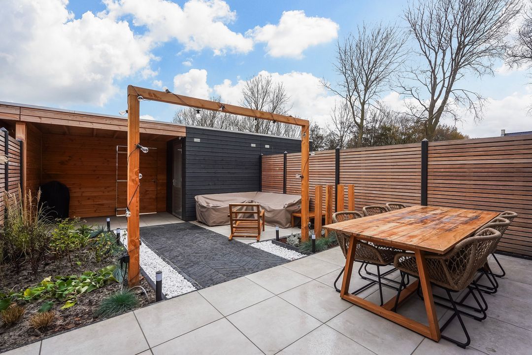 Via de openslaande deuren toegang tot de riante fraai aangelegde achtertuin, gelegen op het noordwesten met vrij uitzicht en middag- en avondzon, een vrijstaande berging met elektra en een achterom.
