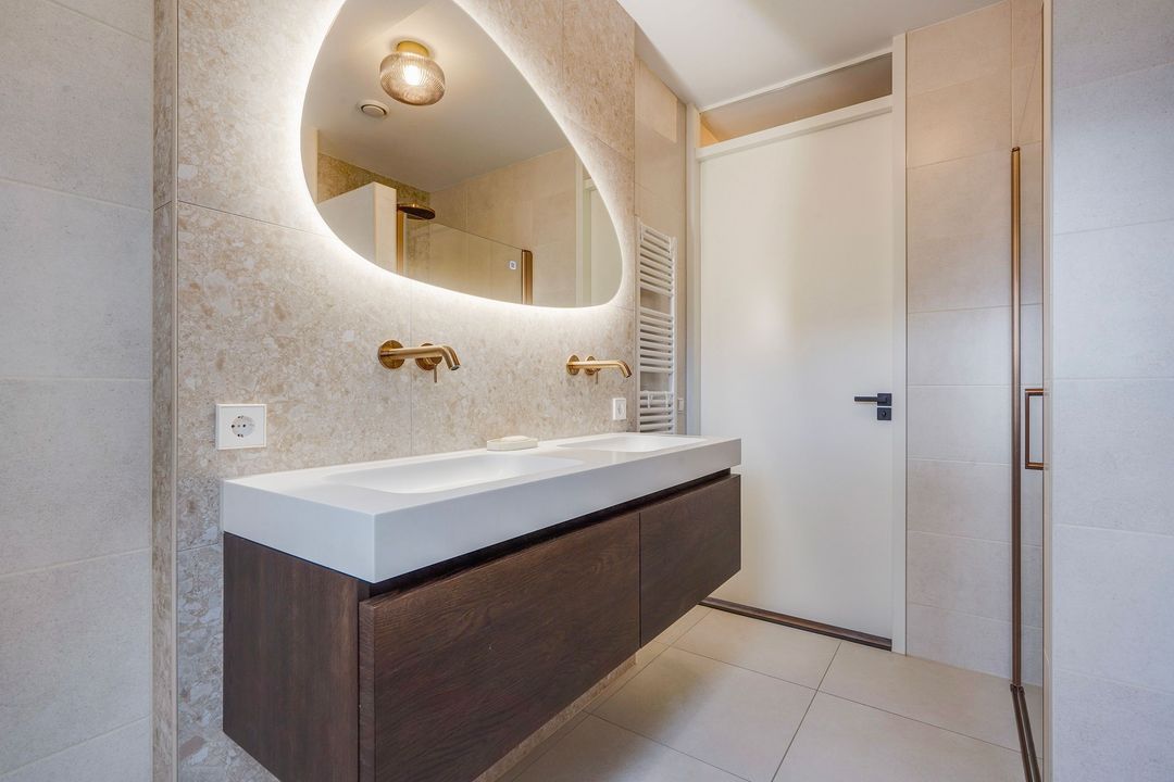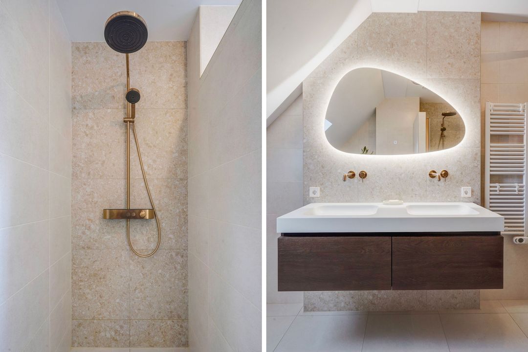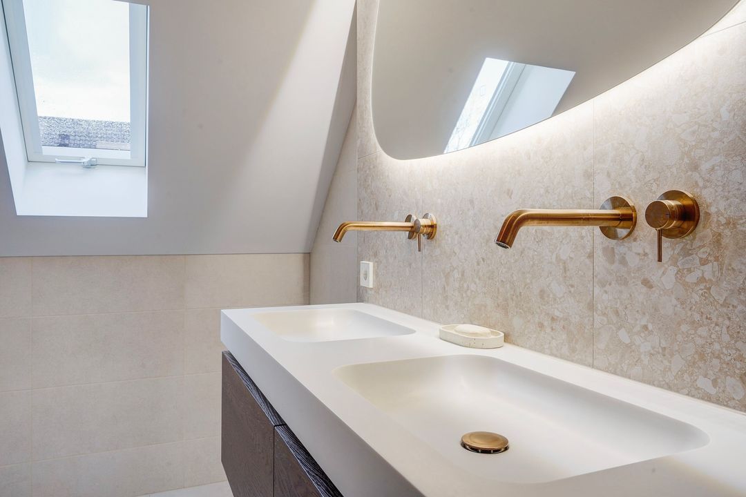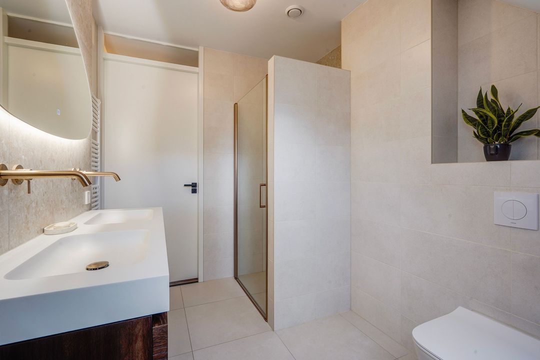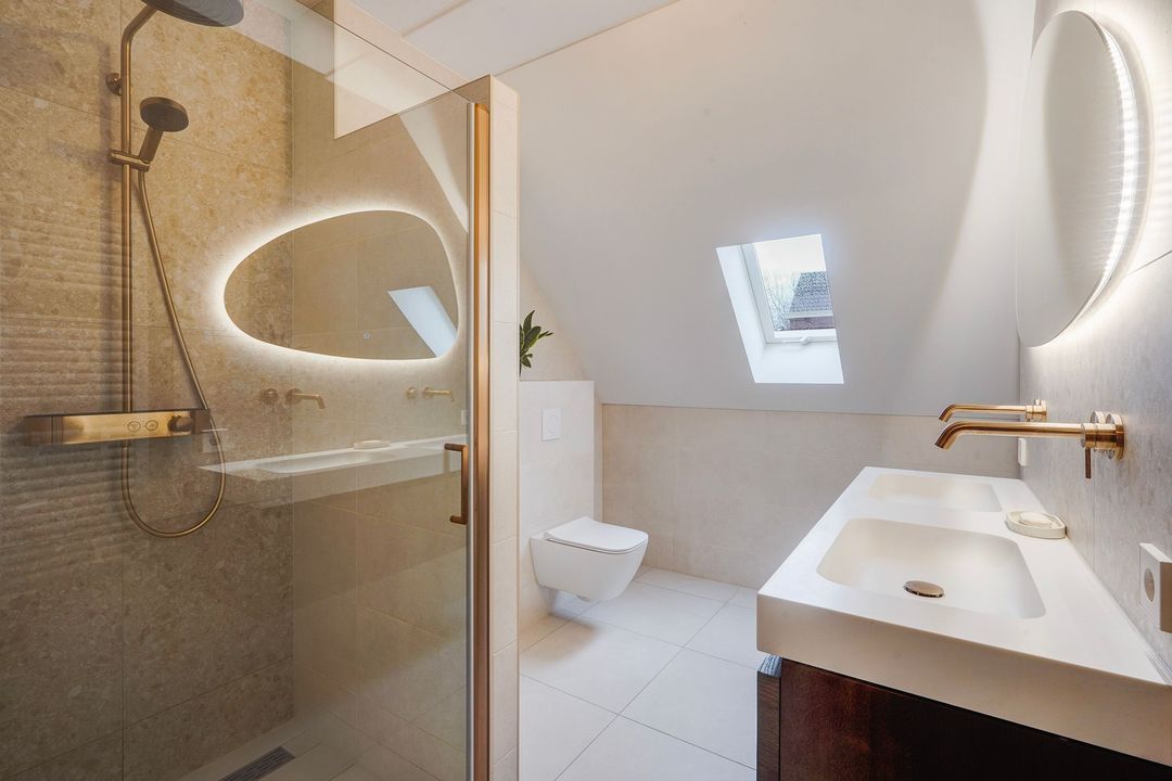 Overloop, fraai geheel betegelde badkamer voorzien van inloop(stort)douche, 2e toilet, dubbel wastafelmeubel met inbouw mengkranen, designradiator en dakraam.