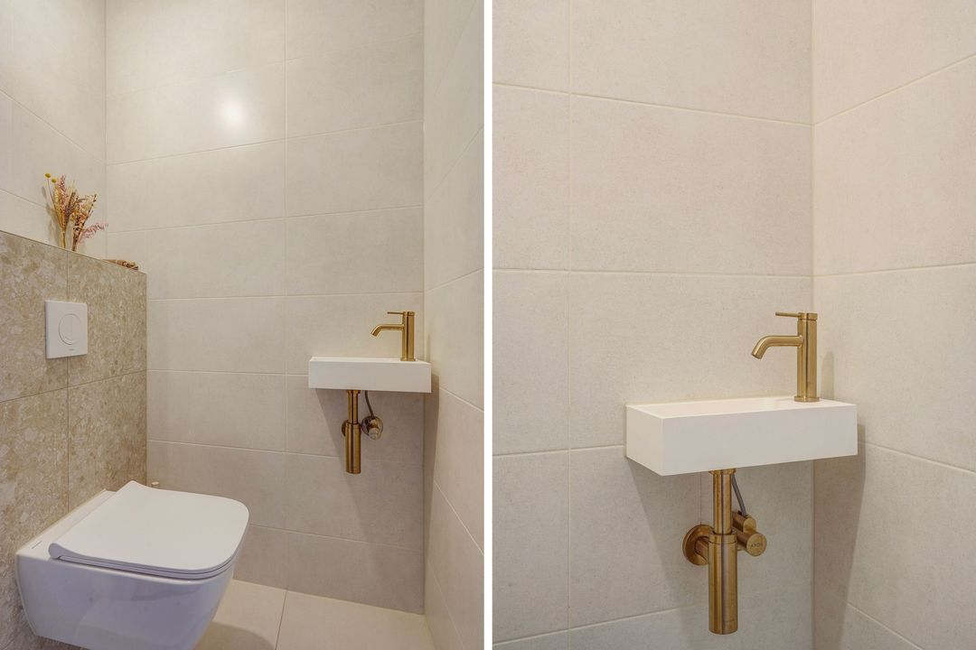 Through the spacious southeast-facing front garden, you enter the house, access the hallway with a beautiful PVC herringbone floor that extends from the ground floor to the first floor, a meter cupboard and a separate toilet with a hand basin.