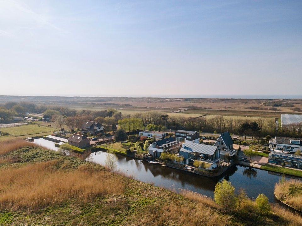 De fraai aangelegde tuin rondom, die qua ontwerp een subtiele verwijzing maakt naar het duingebied, beschikt over meerdere terrassen met uitzicht op water die in verbinding staat met de 'Booma Watering'. Vanaf de eigen aanlegsteiger kunt u in de zomermaanden genieten van passerende bootjes, terwijl u zich omringd voelt door rust en natuur.