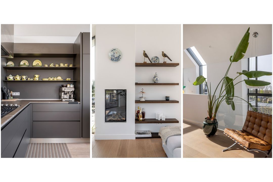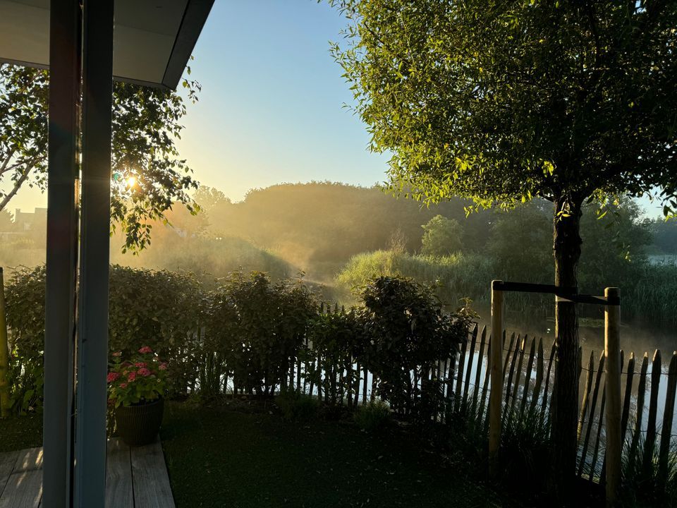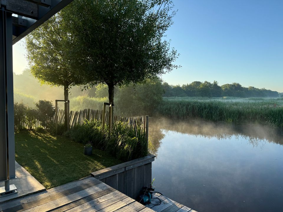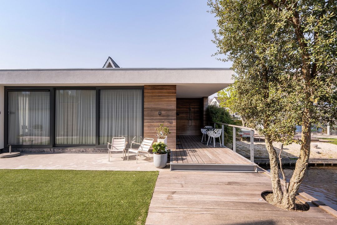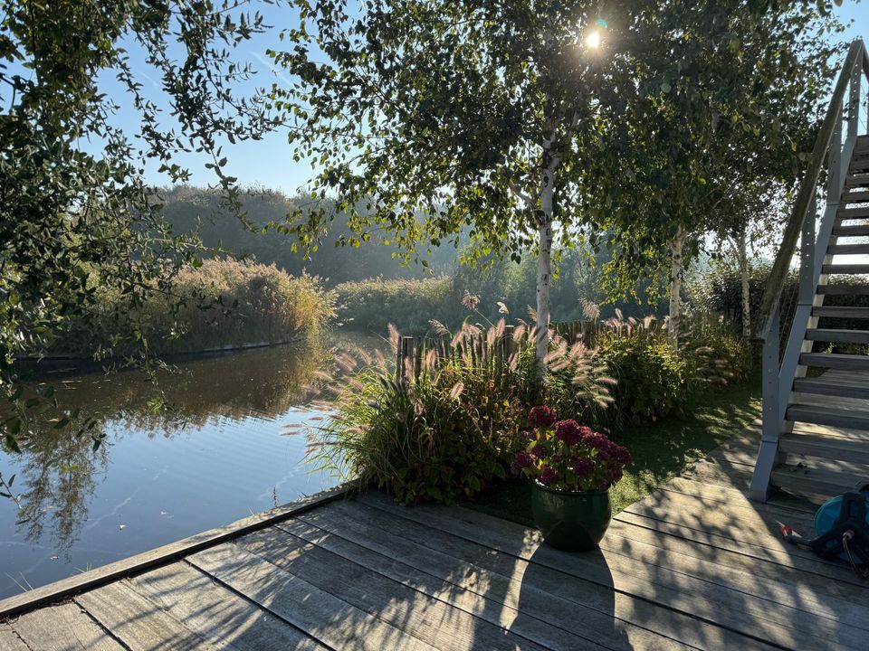 The beautifully landscaped garden, subtly inspired by the nearby dunes, features multiple terraces overlooking the water, which connects to the 'Booma Watering'. In summer, enjoy passing boats from your private jetty, surrounded by peace and nature.