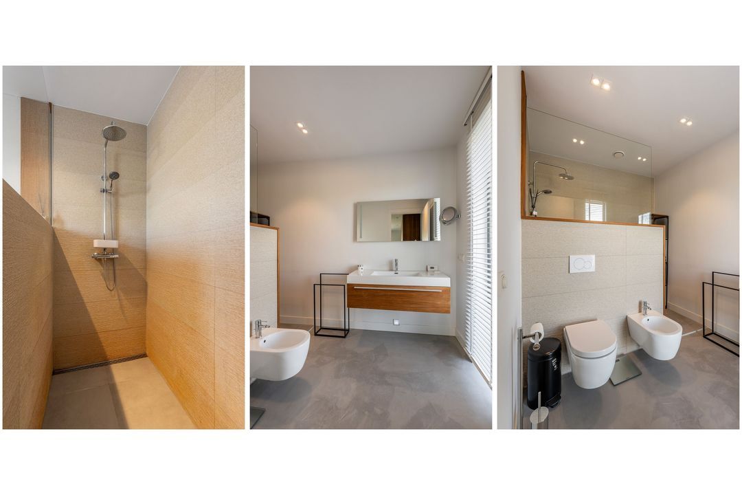 The villa is distinguished by its use of sustainable materials, a bright interior, and a playful layout across both floors. It includes two private parking spaces and a garage with a charging station for your electric car.