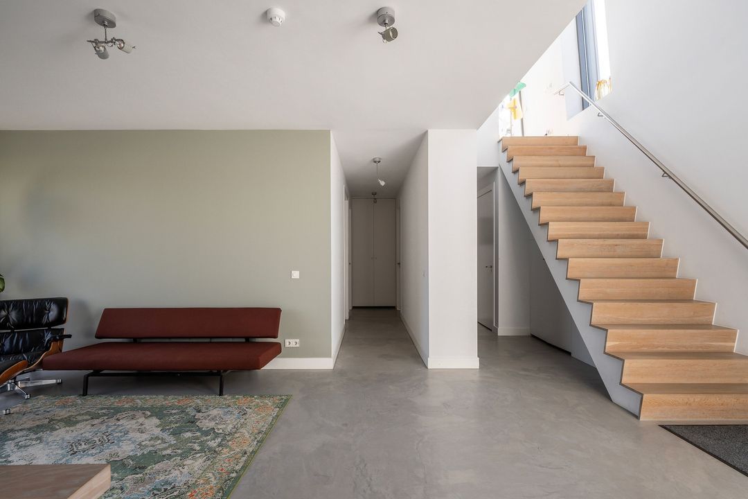 Under the staircase, you'll find a custom-built wardrobe and additional storage space, next to a modern toilet and washbasin. The entire ground floor features a grey poured concrete floor with underfloor heating.