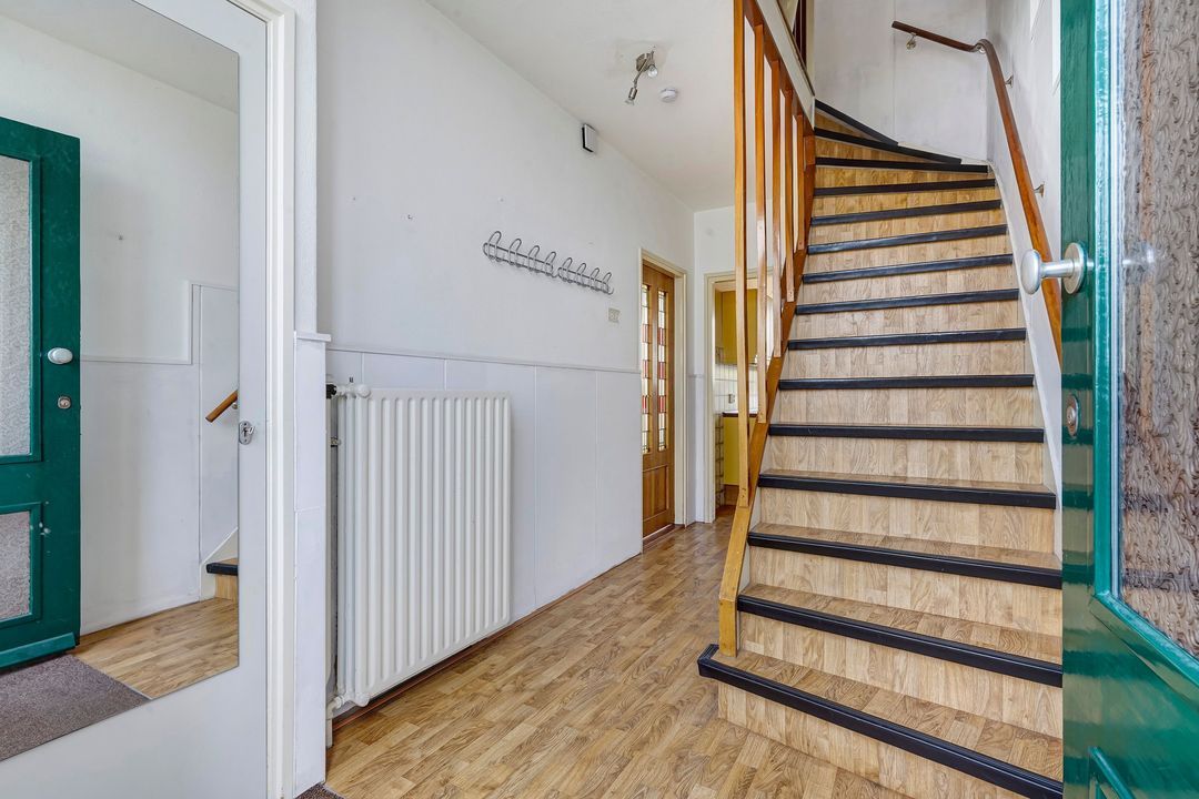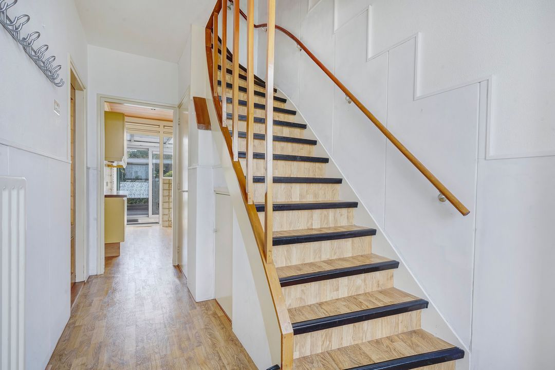 Entree in een aangebouwde vestibule, gang, bergruimte onder de trap, toilet met fontein.