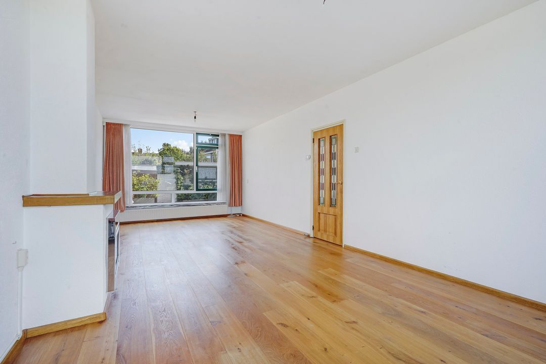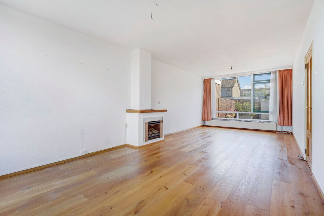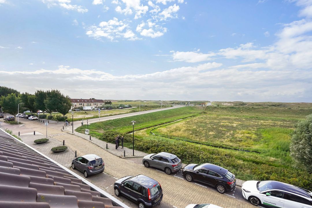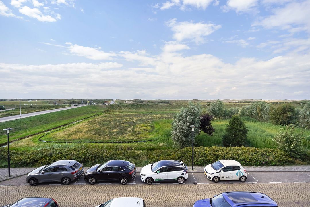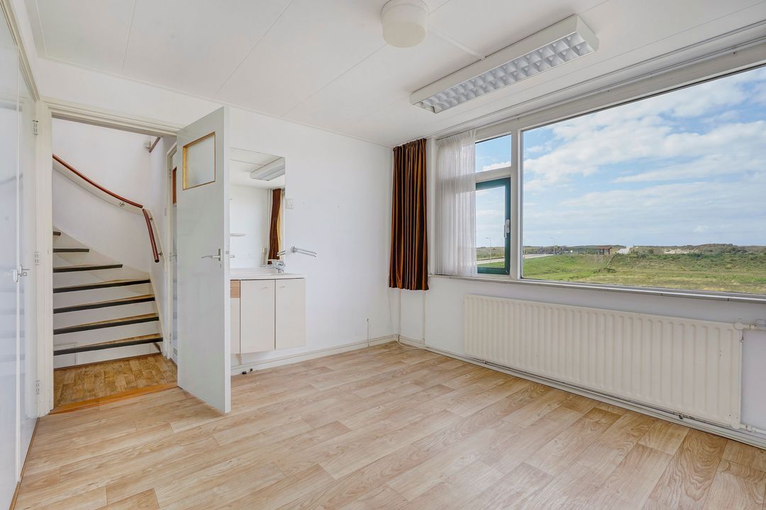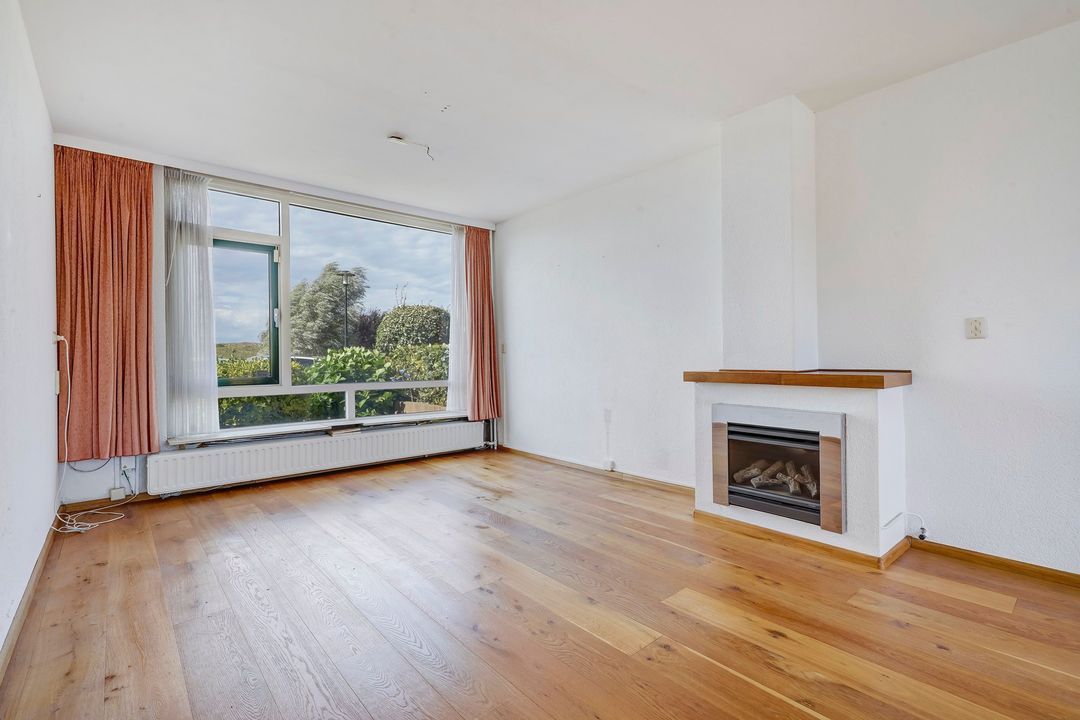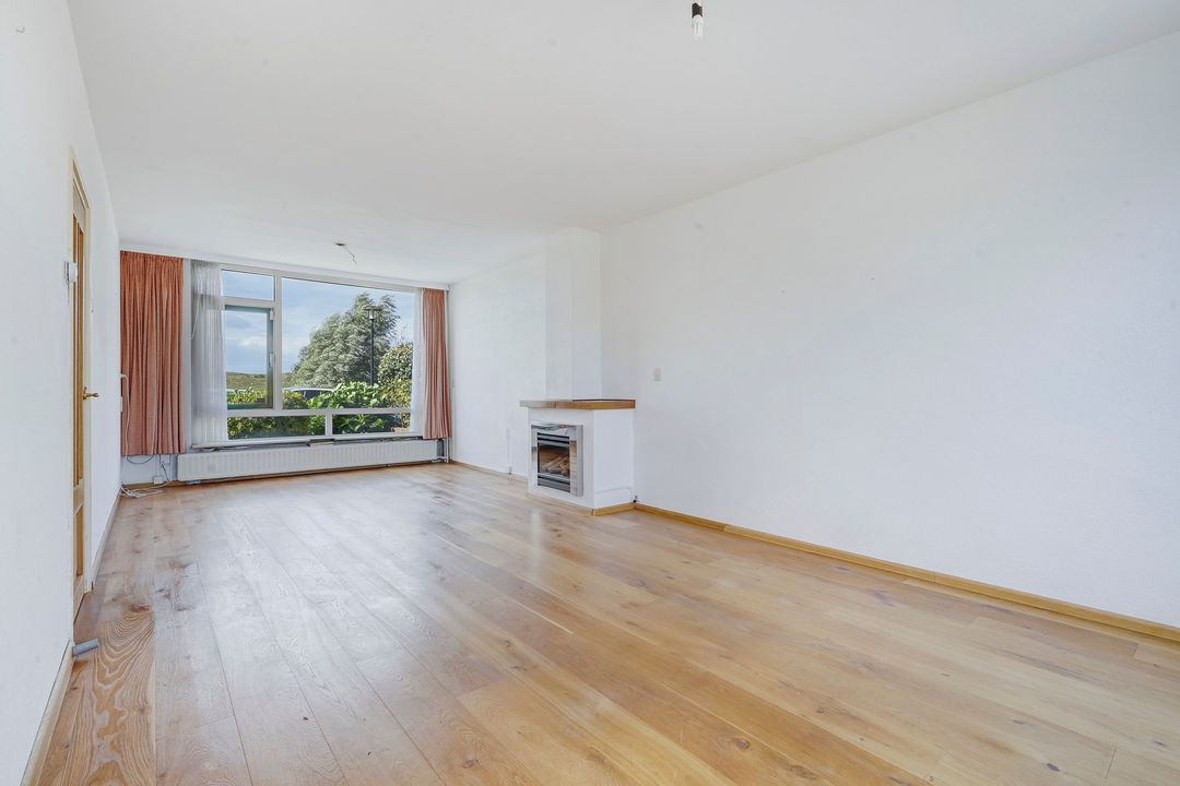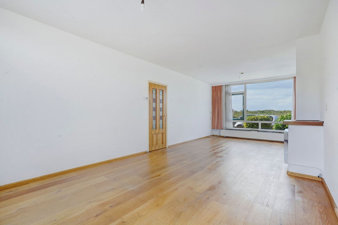Lichte woonkamer met schitterend vrij uitzicht op de duinen en strandopgang, houten vloerdelen en schouw voorzien van een gashaard.
