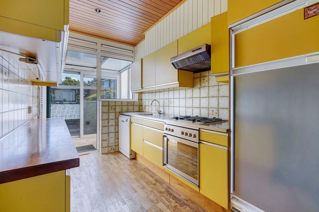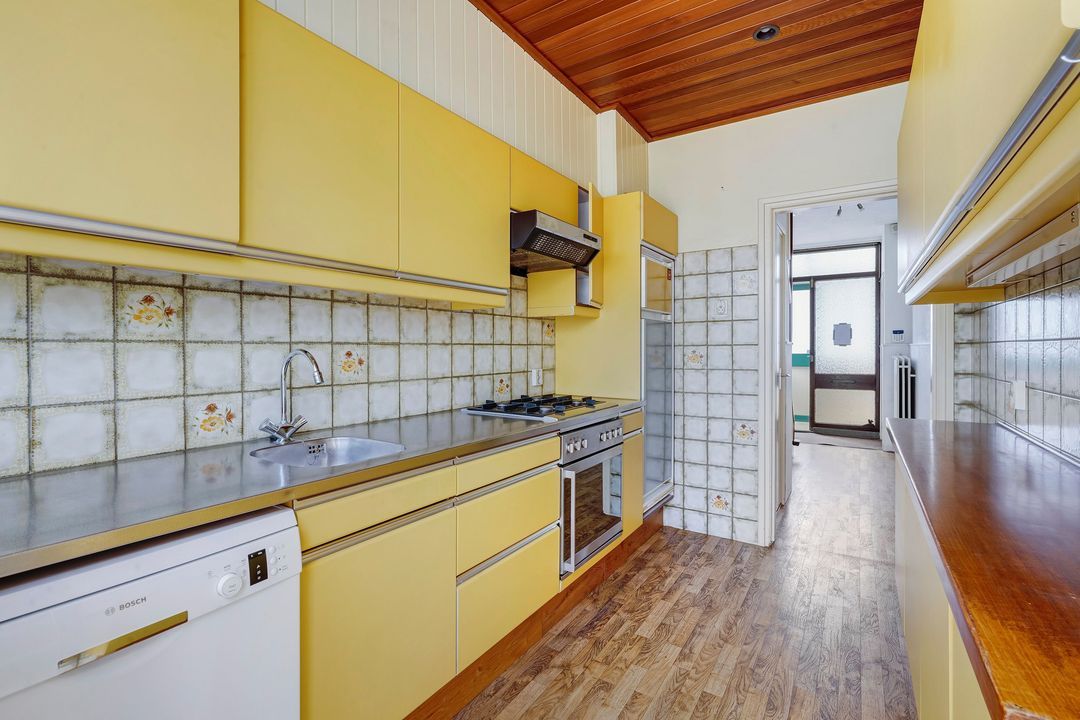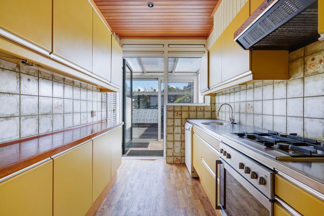 Keuken voorzien van een gedateerd keukenblok, toegang naar den serre/bijkeuken en tuin op het zuidoosten voorzien van een achterom en 2 bergingen.