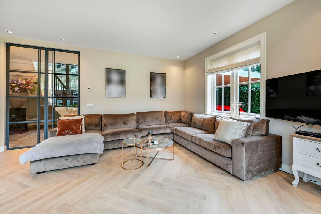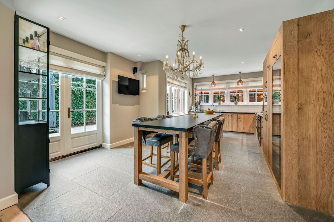 From the hallway black steel French doors lead to the charming living/dining room with herringbone PVC flooring, wooden fireplace with wood-burning stove, bay window, and open, spacious oak kitchen equipped with an induction stove with 4 matching ovens, combination microwave, wine cooler, double recessed sink, Quooker, dishwasher, refrigerator, and island with a bar top.
