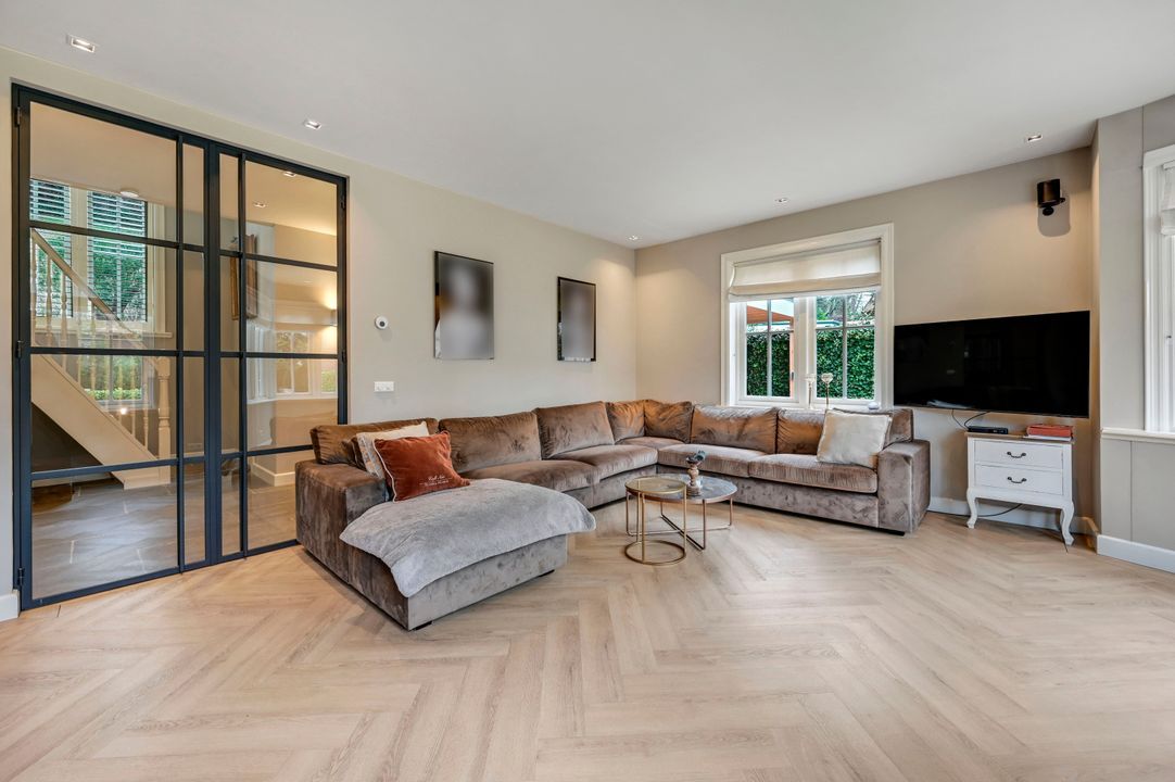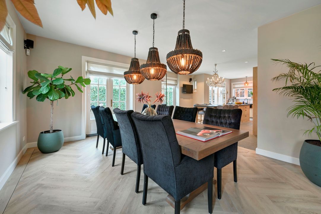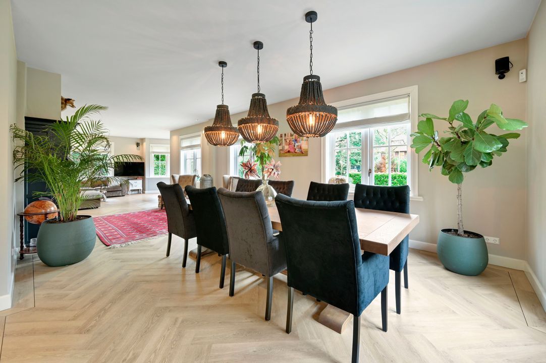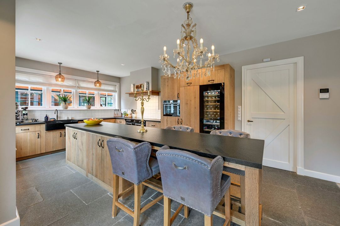 Vanuit de gang openslaande zwart stalen deuren naar de sfeervolle woon-/eetkamer voorzien van visgraat pvc vloer, houten schouw met hout open haard, voorerker en open ruime eiken houten keuken voorzien van inductiefornuis met 4 bijbehorende ovens, combi-magnetron, wijnkoelkast, dubbele verzonken spoelbak, Quooker, vaatwasser, koelkast en eiland voorzien van barblad.