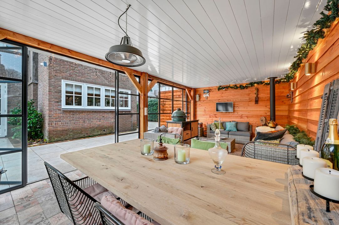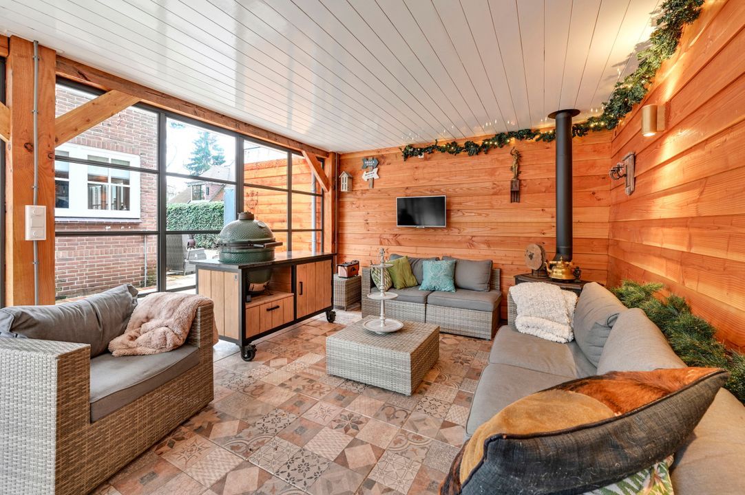 De achtertuin is voorzien van een prachtige tuinkamer/veranda voorzien van hout haard en elektra en fraaie stalen openslaande deuren. De wanden zijn voorzien van een houten betimmering en vloertegels met motief.