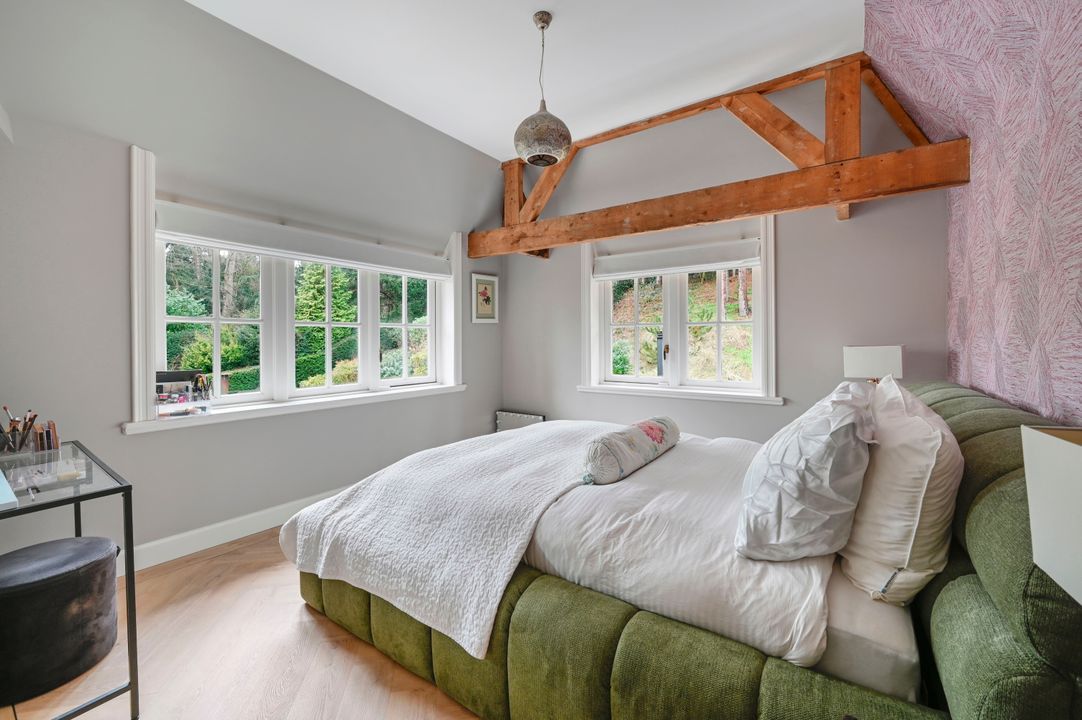 Landing, a charming spacious attic room with herringbone PVC flooring, two dormer windows with arched windows, open to a dressing room, and another en-suite bathroom with a walk-in shower, vanity, and toilet. The bathroom also features a dormer window with arched window.