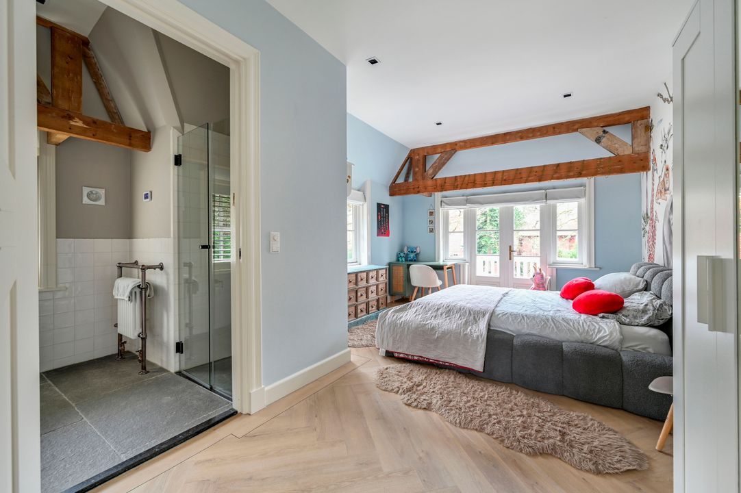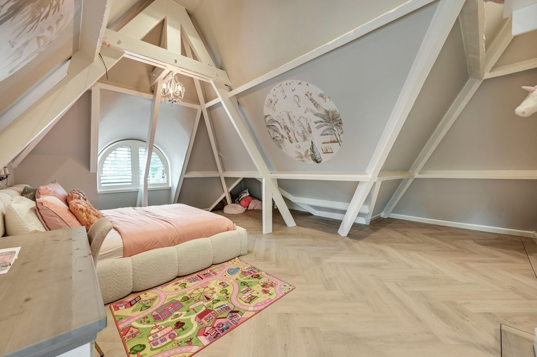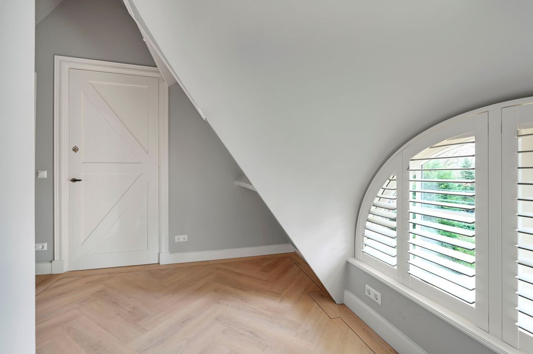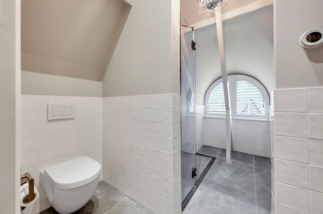 Overloop, sfeervolle ruime zolderkamer voorzien van visgraat pvc vloer, 2 dakkapellen met boogvenster, in open verbinding met een kleedkamer en wederom annex een eigen badkamer voorzien van inloopdouche, wastafelmeubel en toilet. Badkamer is tevens voorzien van een dakkapel met boogvenster.