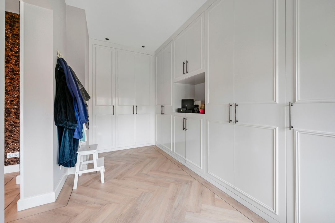 Landing with herringbone PVC flooring throughout the entire floor, a built-in closet with connection for the washing machine, a charming bedroom at the rear with a beautiful view and a luxurious bathroom with a freestanding bath, double vanity, double shower, and toilet, a spacious front bedroom with the same bath bathroom and dressing room featuring an L-shaped wardrobe, a side bedroom with French doors leading to a balcony and an en-suite bathroom with a walk-in shower, vanity, and toilet.