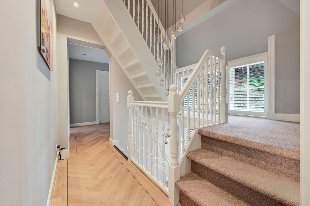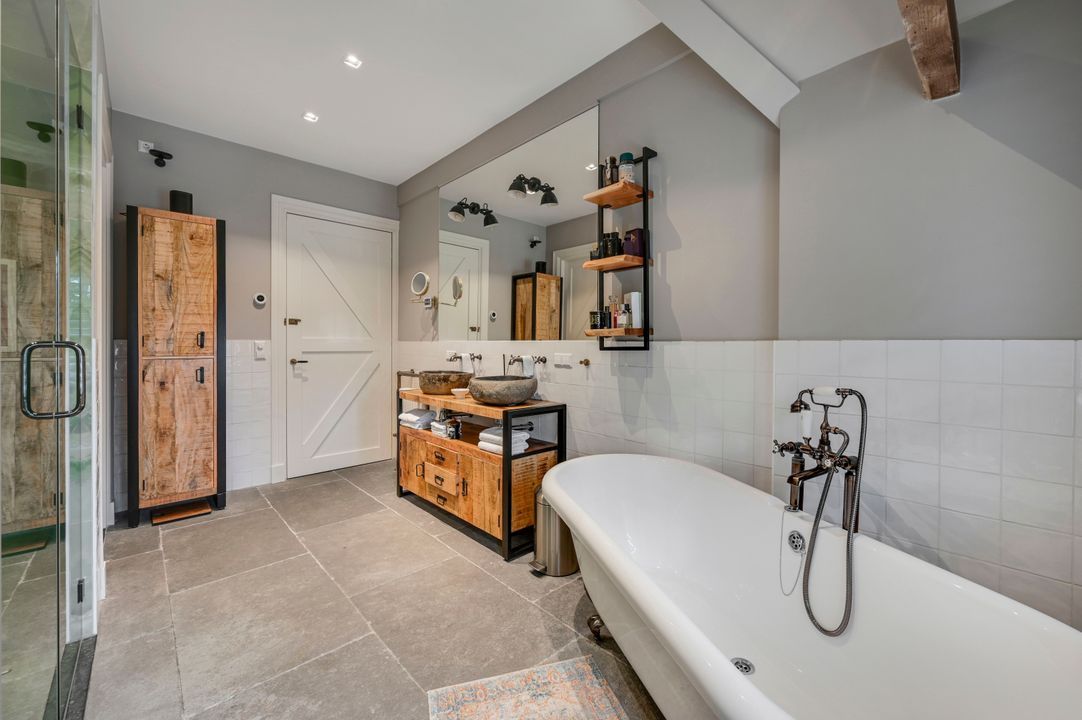 Overloop met visgraat pvc vloer doorgelegd over de gehele verdieping, vaste kast met wasmachine aansluiting, sfeervolle slaapkamer aan de achterzijde met prachtig uitzicht annex luxe badkamer met losstaand bad, dubbel wastafelmeubel, dubbele douche en toilet, ruime voorslaapkamer annex dezelfde badkamer en kleedkamer voorzien van L-vormige kastenwand, zijslaapkamer met openslaande deuren naar een balkon en annex eigen badkamer voorzien van inloopdouche, wastafelmeubel en toilet.