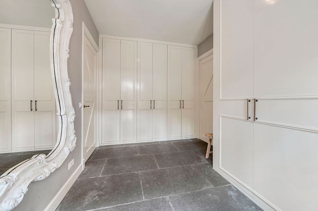 Entrance at the side of the house, spacious hallway with natural stone floor tiles extending into the kitchen, boiler room with skylight and built-in closet, spacious toilet, urinal, and hand basin, and a dressing room with French doors leading to the back garden.