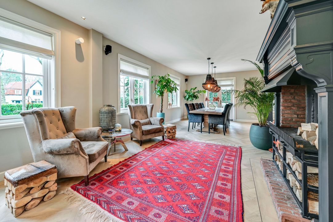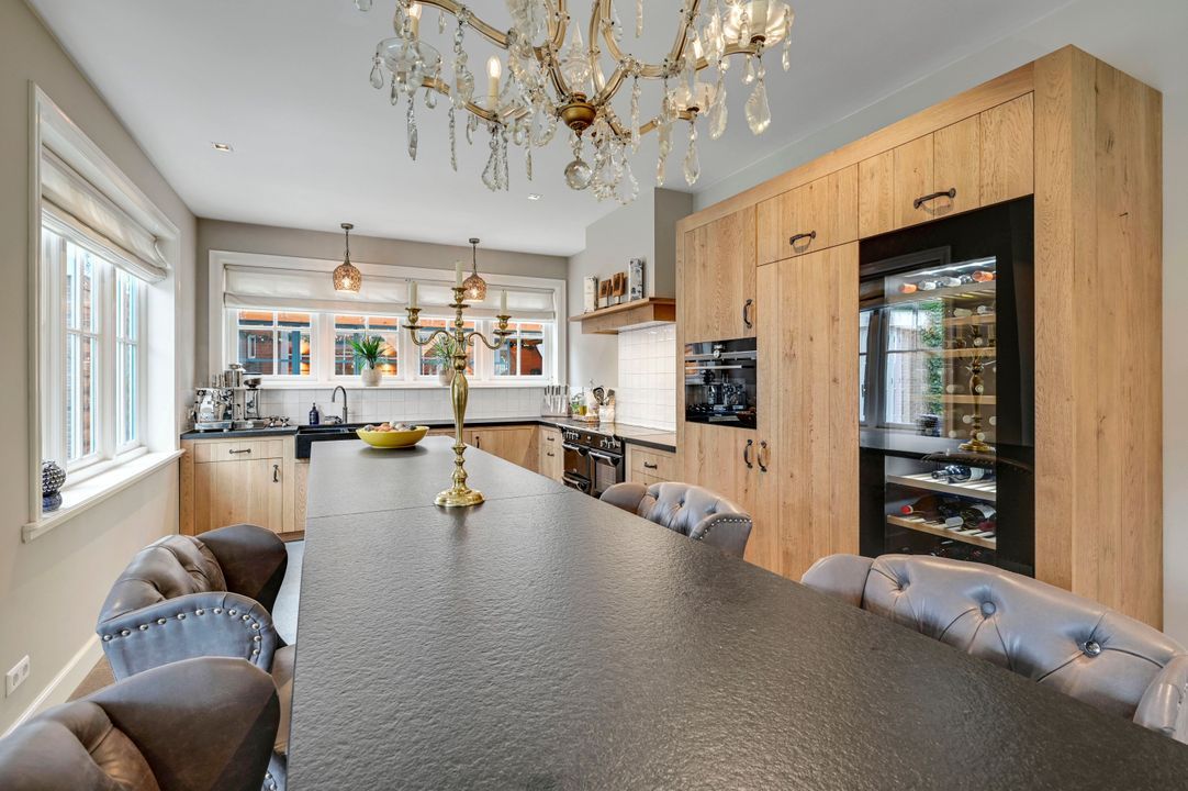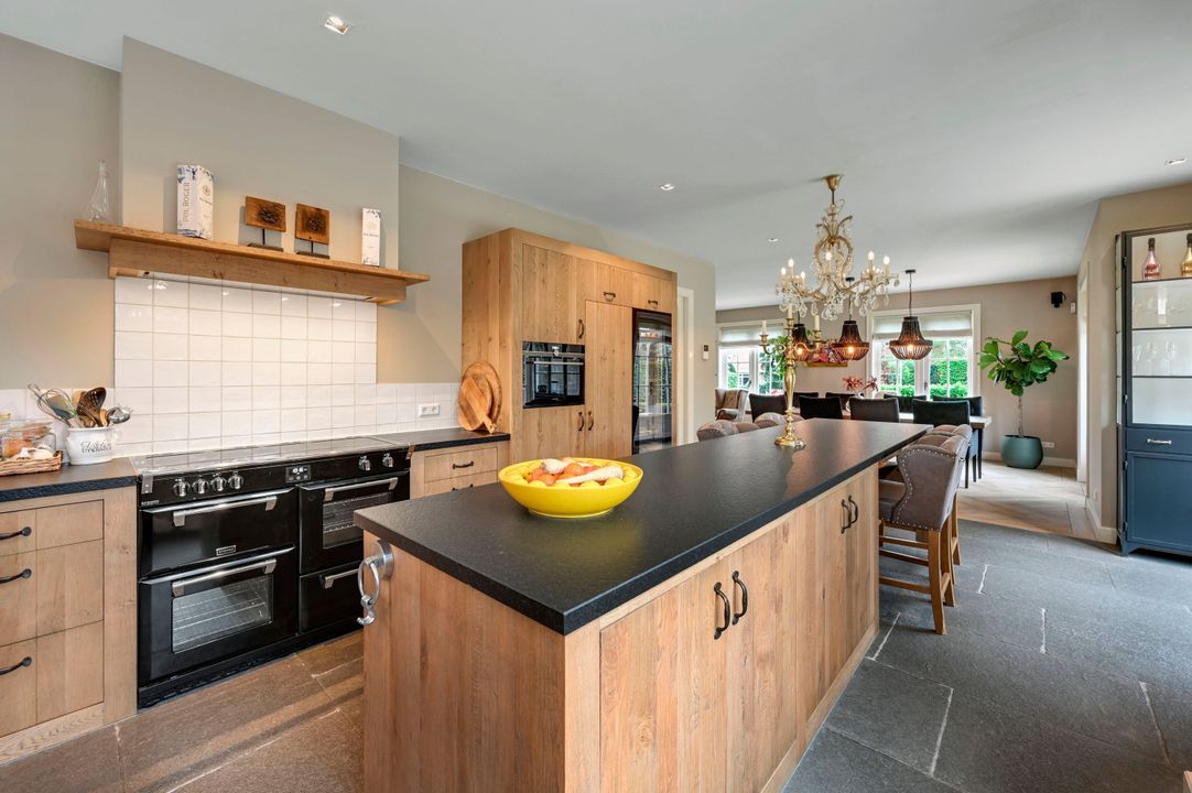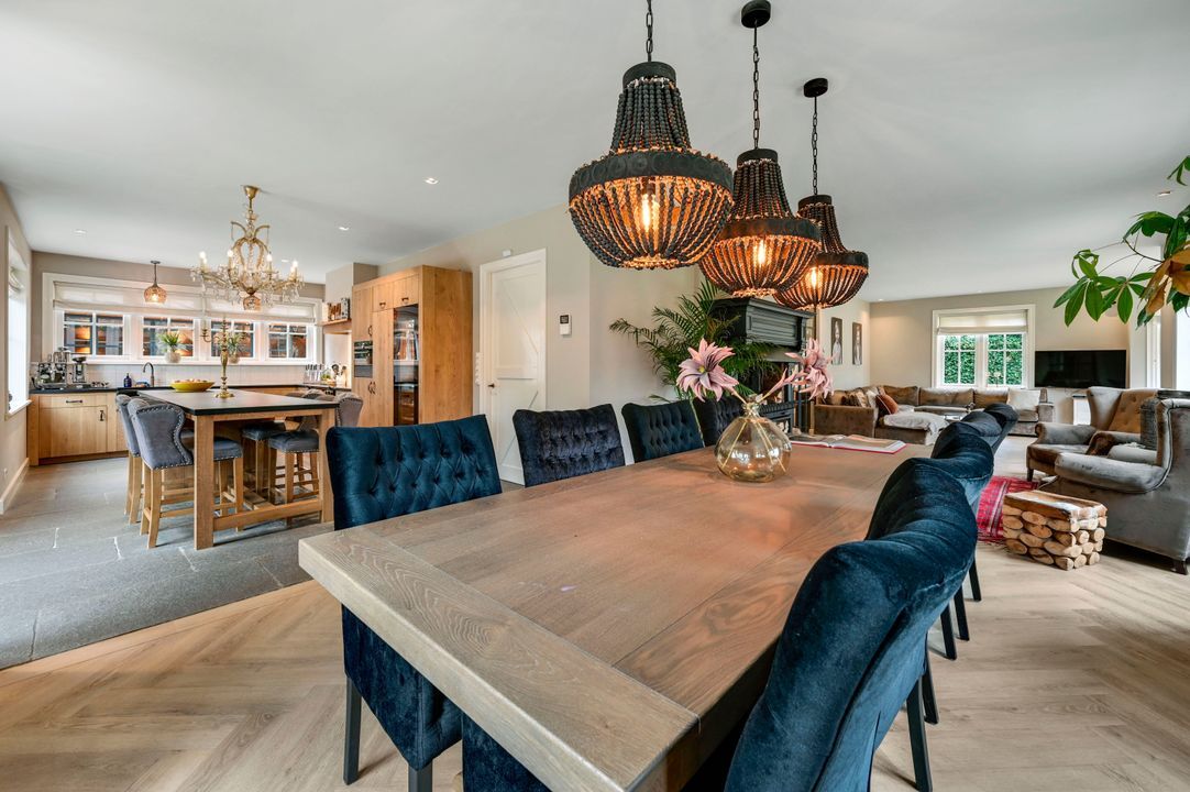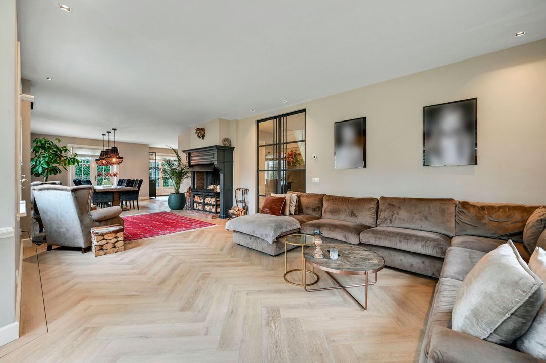 Vanuit de gang openslaande zwart stalen deuren naar de sfeervolle woon-/eetkamer voorzien van visgraat pvc vloer, houten schouw met hout open haard, voorerker en open ruime eiken houten keuken voorzien van inductiefornuis met 4 bijbehorende ovens, combi-magnetron, wijnkoelkast, dubbele verzonken spoelbak, Quooker, vaatwasser, koelkast en eiland voorzien van barblad.