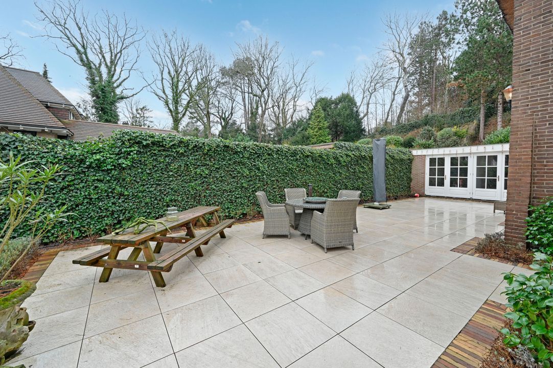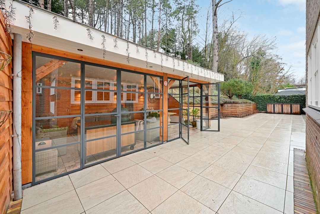 De achtertuin is voorzien van een prachtige tuinkamer/veranda voorzien van hout haard en elektra en fraaie stalen openslaande deuren. De wanden zijn voorzien van een houten betimmering en vloertegels met motief.