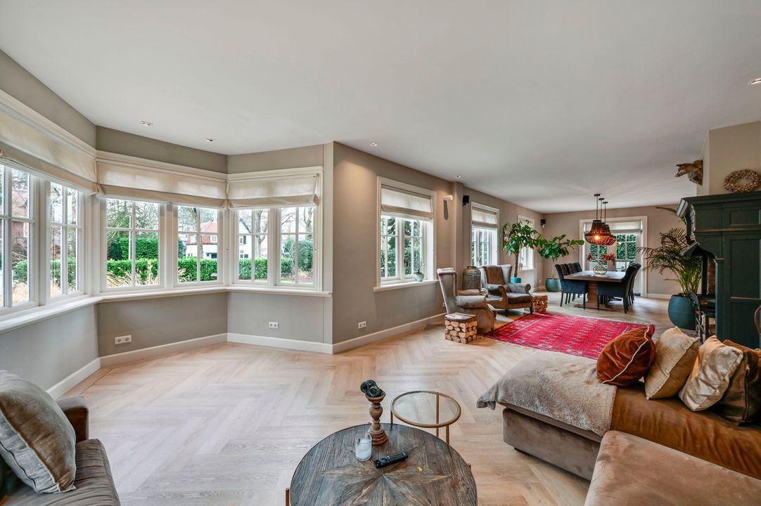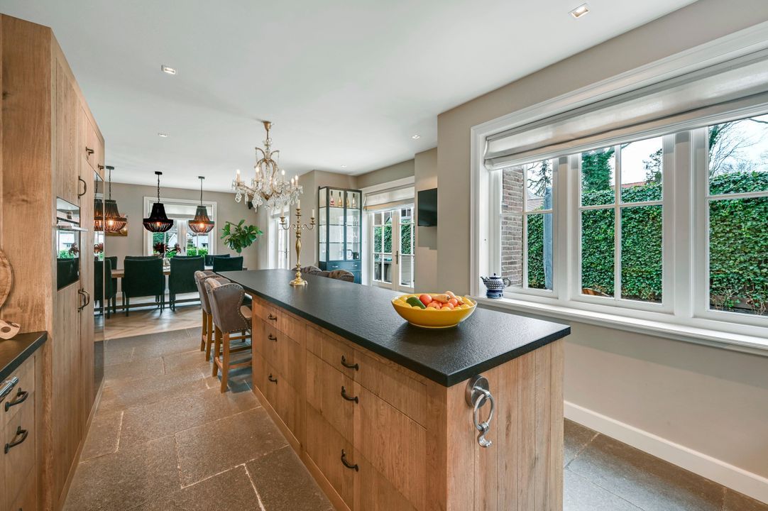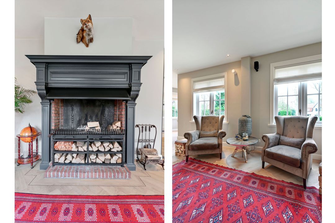 From the hallway black steel French doors lead to the charming living/dining room with herringbone PVC flooring, wooden fireplace with wood-burning stove, bay window, and open, spacious oak kitchen equipped with an induction stove with 4 matching ovens, combination microwave, wine cooler, double recessed sink, Quooker, dishwasher, refrigerator, and island with a bar top.