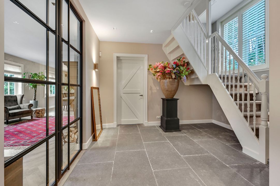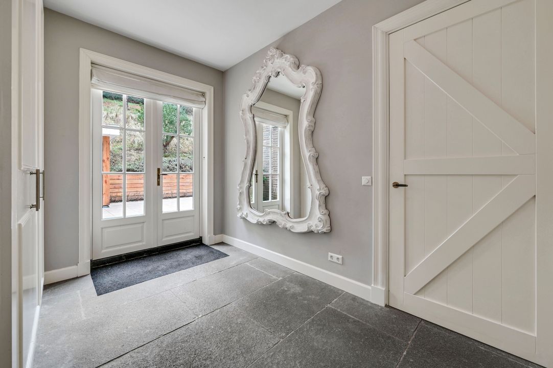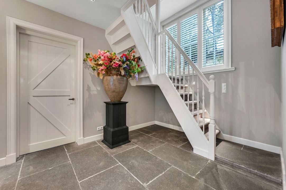 Entree aan de zijkant van de woning, ruime gang met natuurstenen vloertegels doorgelegd in de keuken, stookruimte voorzien van dakraam en vaste kast, ruim toilet met vrijhangend reservoir, urinoir en fontein, garderobekamer voorzien van openslaande deuren naar de achtertuin.