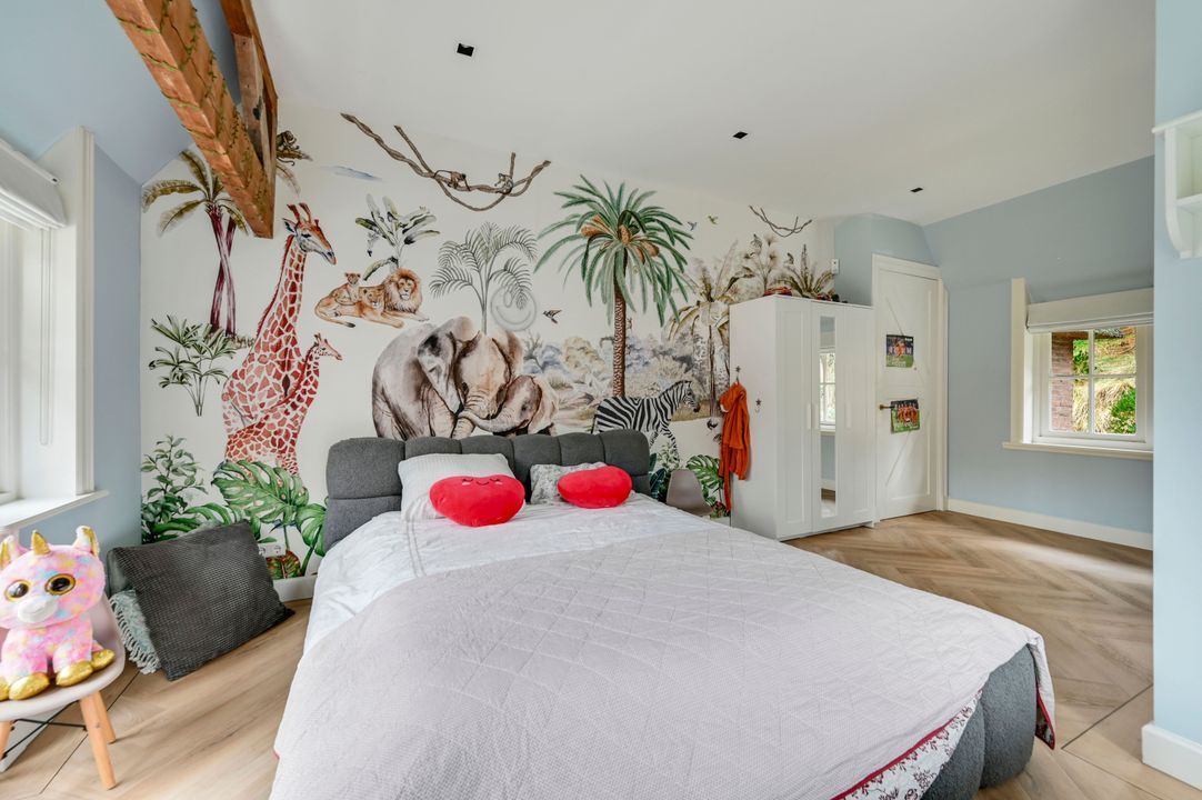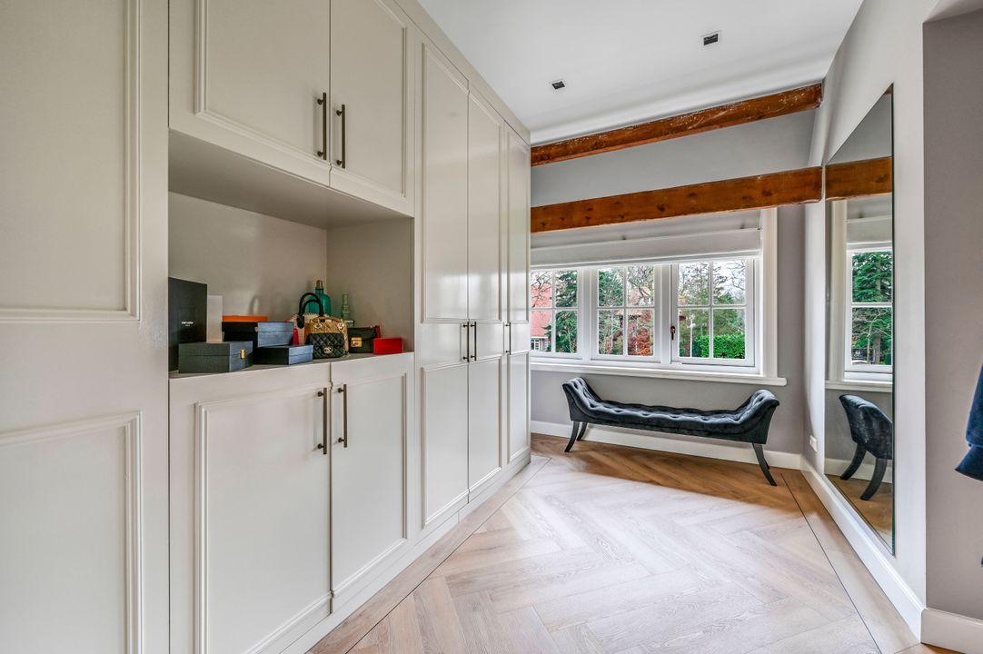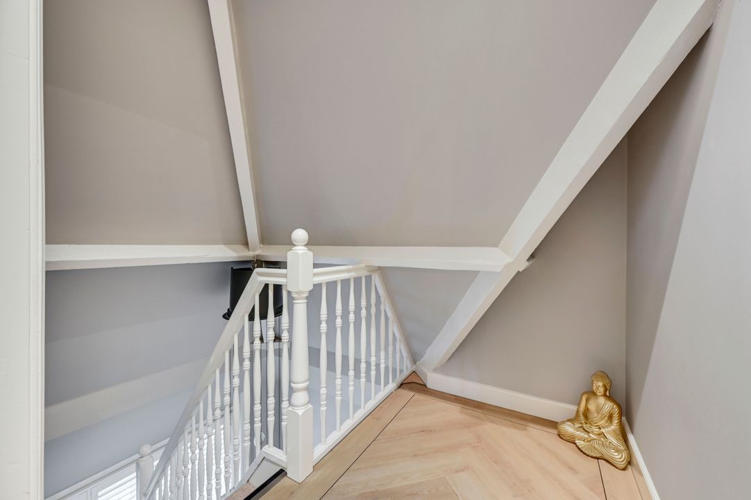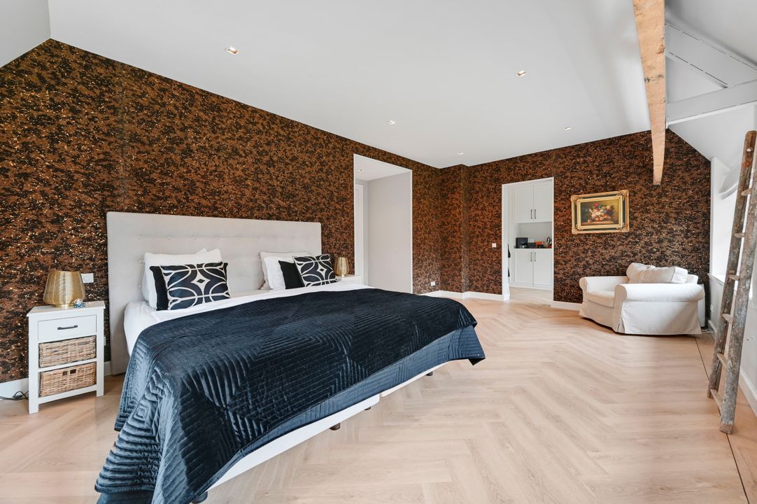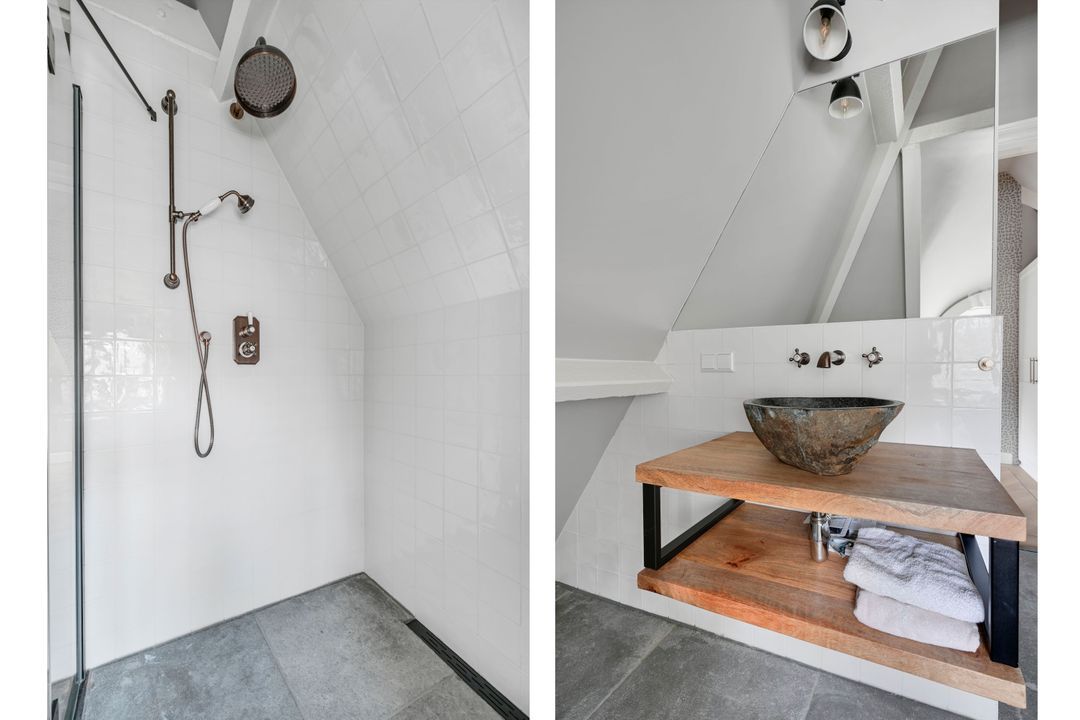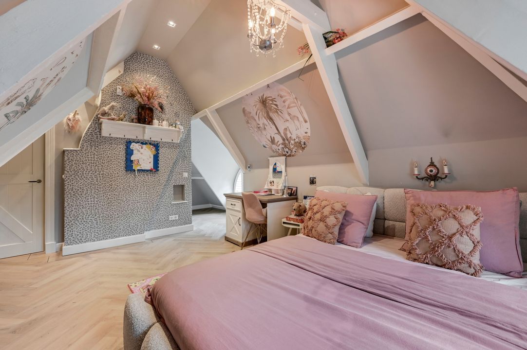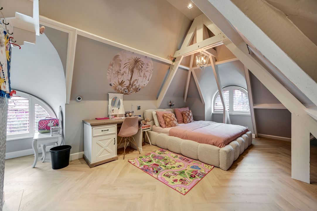 Overloop, sfeervolle ruime zolderkamer voorzien van visgraat pvc vloer, 2 dakkapellen met boogvenster, in open verbinding met een kleedkamer en wederom annex een eigen badkamer voorzien van inloopdouche, wastafelmeubel en toilet. Badkamer is tevens voorzien van een dakkapel met boogvenster.