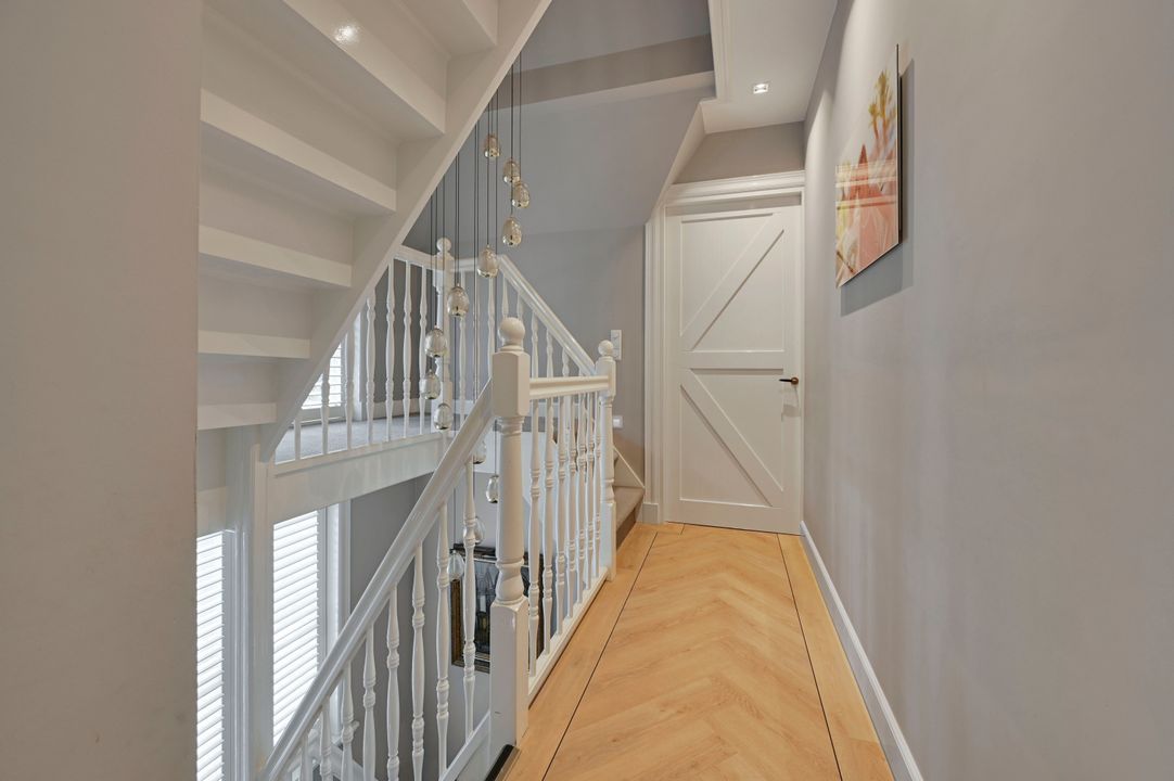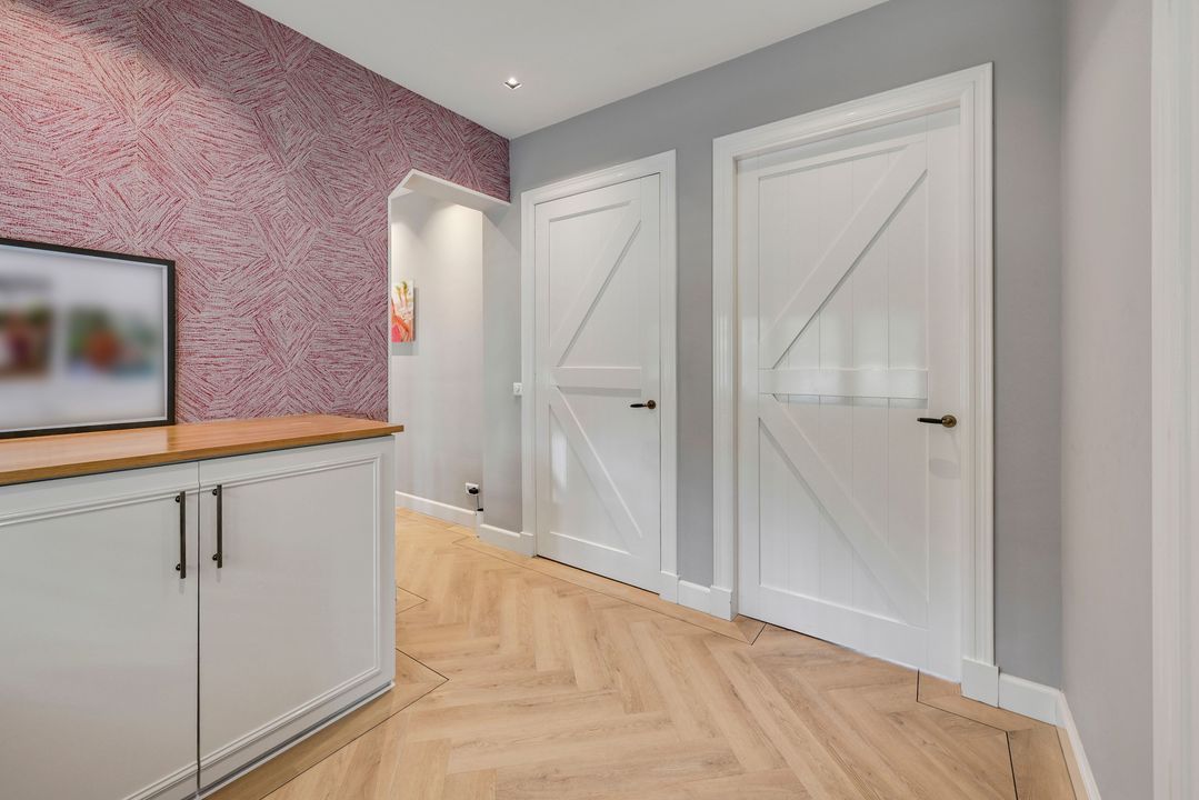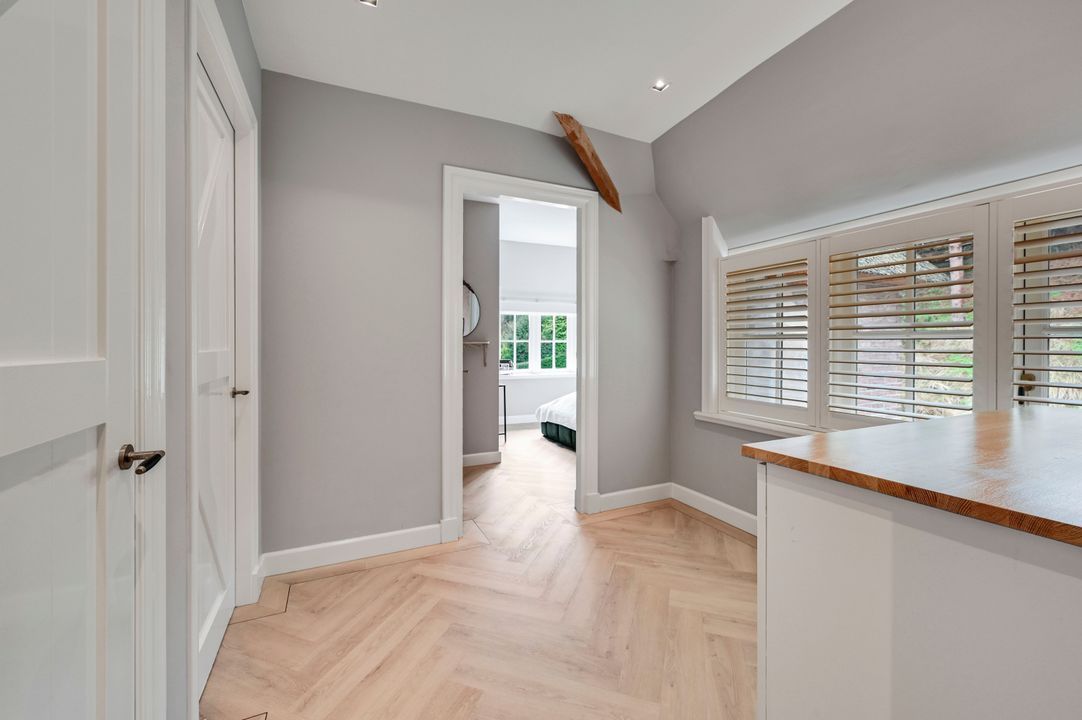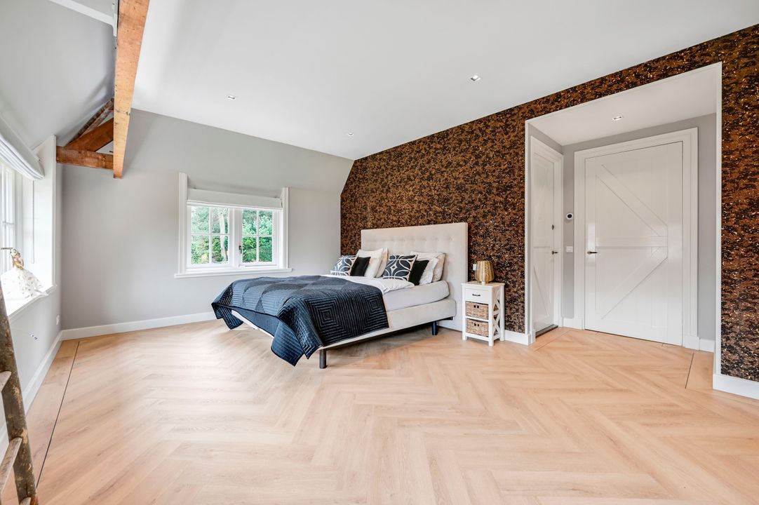 Overloop met visgraat pvc vloer doorgelegd over de gehele verdieping, vaste kast met wasmachine aansluiting, sfeervolle slaapkamer aan de achterzijde met prachtig uitzicht annex luxe badkamer met losstaand bad, dubbel wastafelmeubel, dubbele douche en toilet, ruime voorslaapkamer annex dezelfde badkamer en kleedkamer voorzien van L-vormige kastenwand, zijslaapkamer met openslaande deuren naar een balkon en annex eigen badkamer voorzien van inloopdouche, wastafelmeubel en toilet.