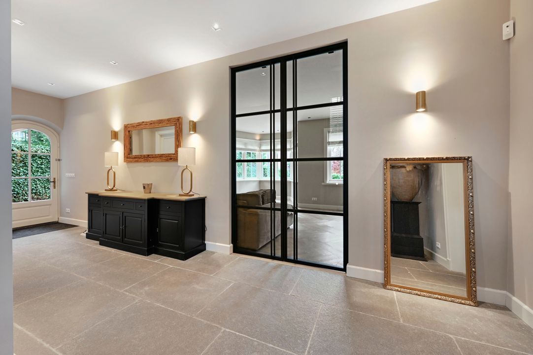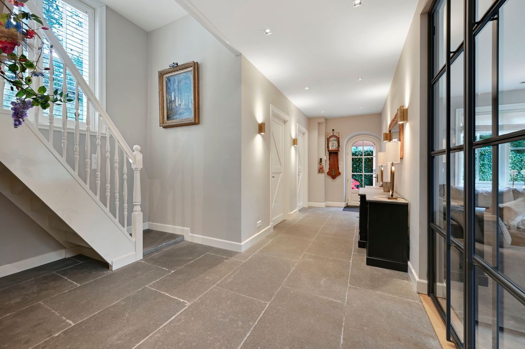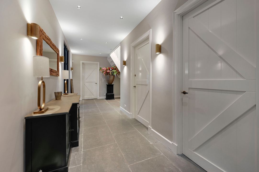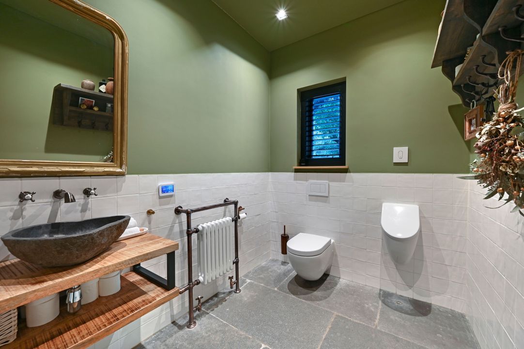 Entrance at the side of the house, spacious hallway with natural stone floor tiles extending into the kitchen, boiler room with skylight and built-in closet, spacious toilet, urinal, and hand basin, and a dressing room with French doors leading to the back garden.