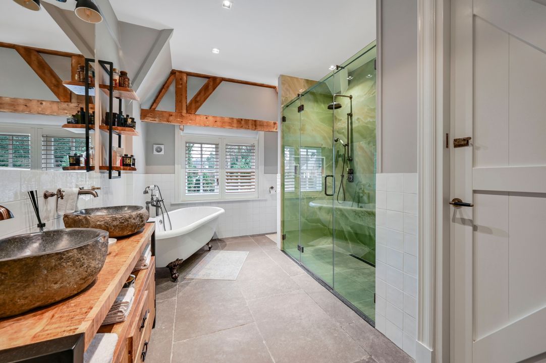 Landing, a charming spacious attic room with herringbone PVC flooring, two dormer windows with arched windows, open to a dressing room, and another en-suite bathroom with a walk-in shower, vanity, and toilet. The bathroom also features a dormer window with arched window.